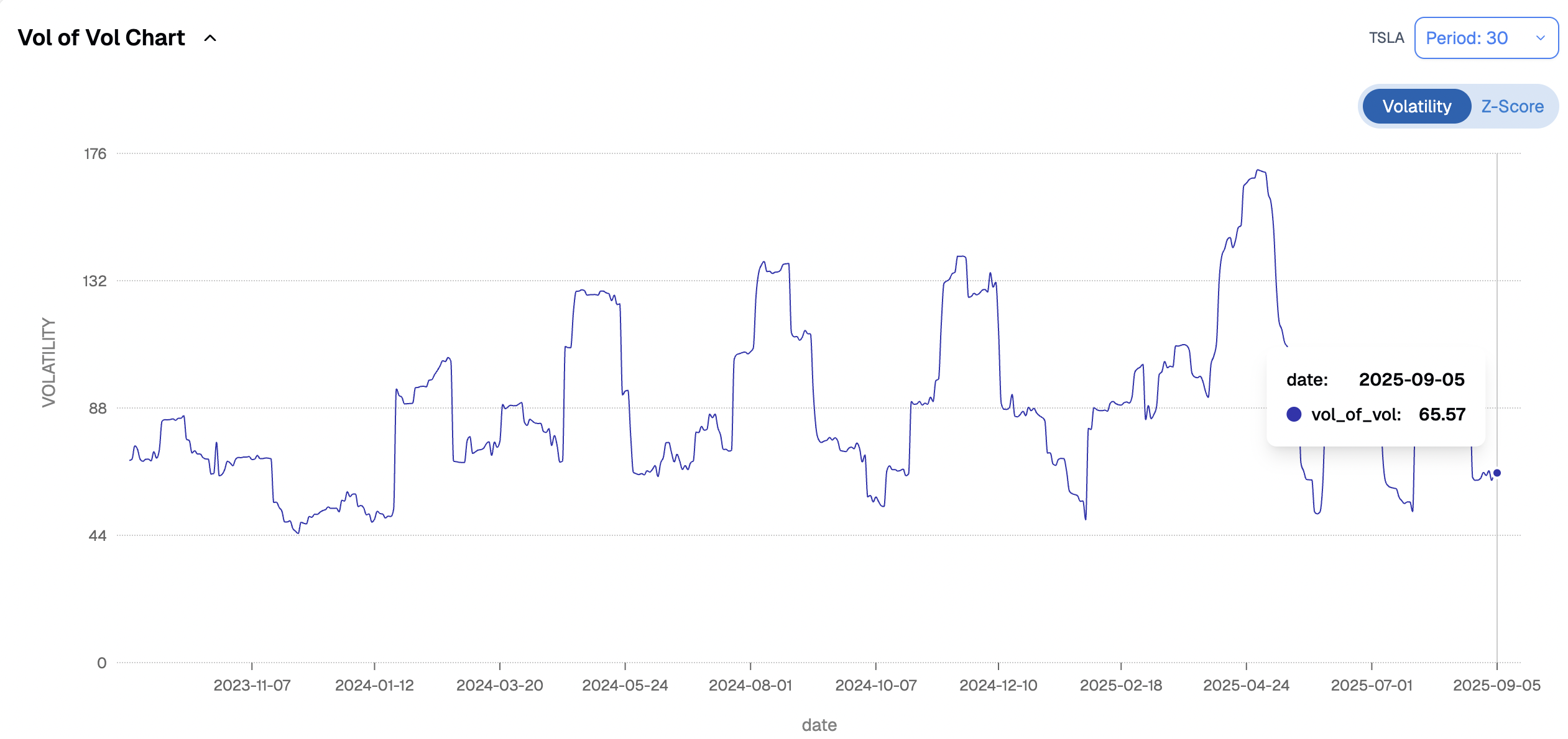 The vol-of-vol chart reinforces the point. After spiking during the spring turbulence, it has deflated to low levels. Traders are not paying for vega convexity or for insurance against a new volatility regime shift. The result is a deceptively calm picture: realized quiet, vol-of-vol subdued, and skew tilted in a way that runs counter to the official bearish tone surrounding Tesla.