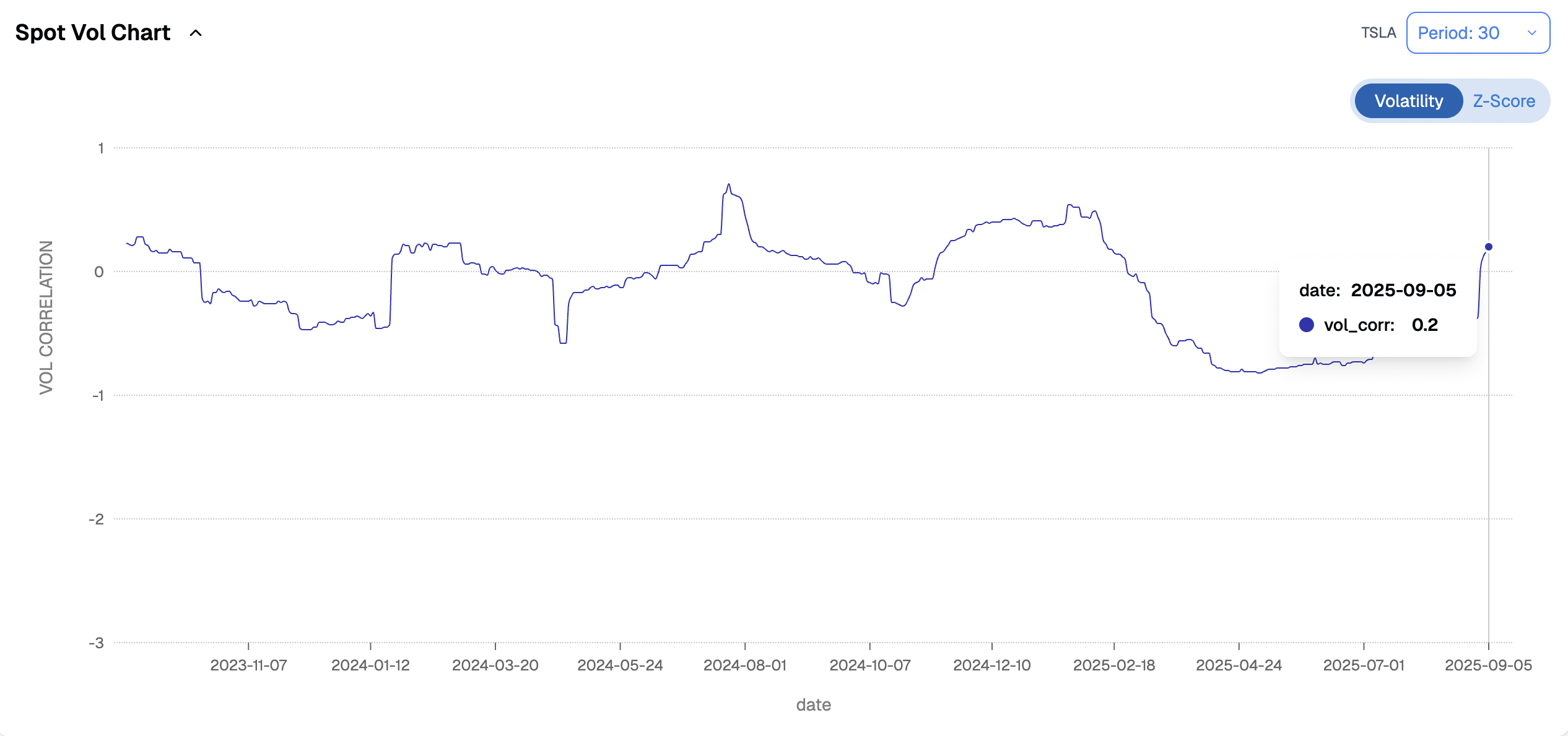 Another subtle but important shift has taken place in Tesla: the spot/vol correlation, which for much of the past year sat deep in negative territory, has been creeping higher toward zero. In plain terms, that means volatility is no longer moving just as a hedge against selloffs. Instead, it is starting to respond on both sides — spiking not only when the stock trades lower, but also when it rallies.