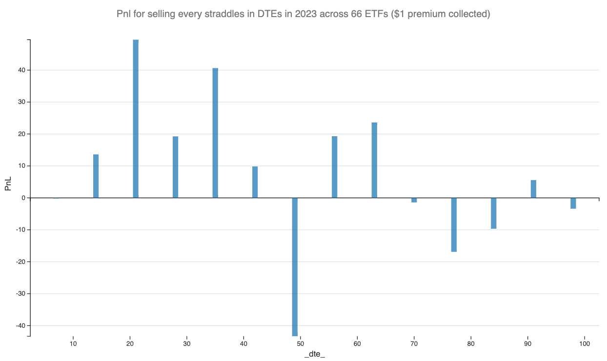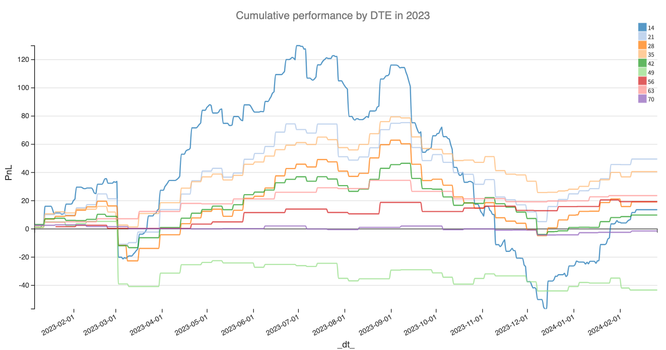 Next, we dive into the PnL curve by DTEs for 2023 to assess not just the profitability but also the stability of returns. A consistently positive PnL is desirable, but the ultimate goal is to achieve this with minimal variance, ensuring that gains are made in a steady and predictable manner.