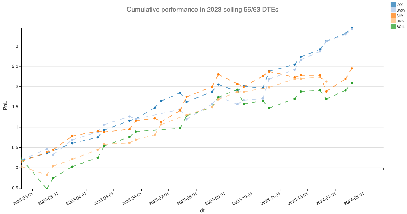 Essentially, selling the front months and hedging with the back month is a sensible approach to developing an options portfolio, especially when you observe some contango in the volatility term structure - which was the case for most of 2023.