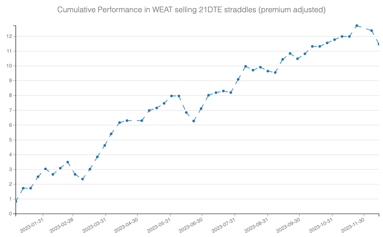 Commodities always have a variance risk premium built in, considering the nature of the business. The weather can be difficult to predict a few months in advance, making it difficult to anticipate price fluctuations. Add to that the recent geopolitical risks with the war in Ukraine, and you have the premise for a great trade in the WEAT, the ETF tracking wheat prices.