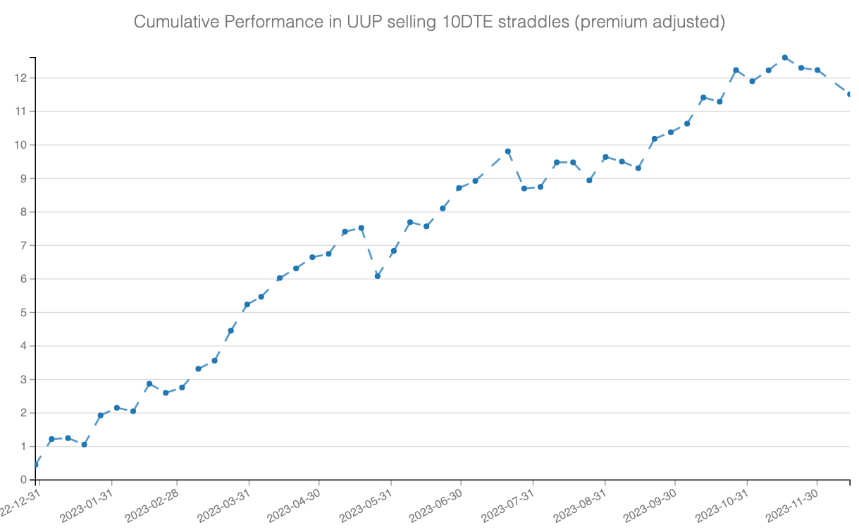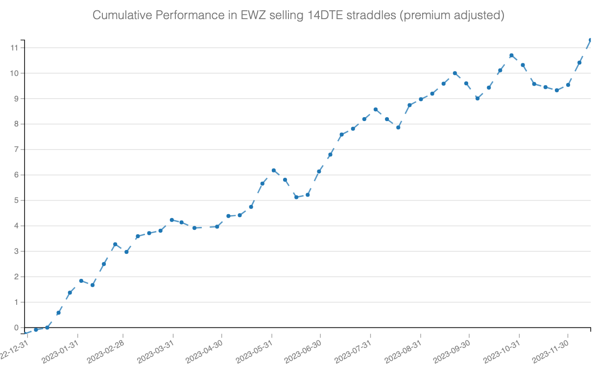 The trade methodology is straightforward. Every Friday, sell the ATM straddle expiring two weeks late and hold until expiration. Despite a couple of bumps on the road, this trade has performed exceptionally well, and we expect it to continue, considering the natural premium associated with robust yet developing economies.