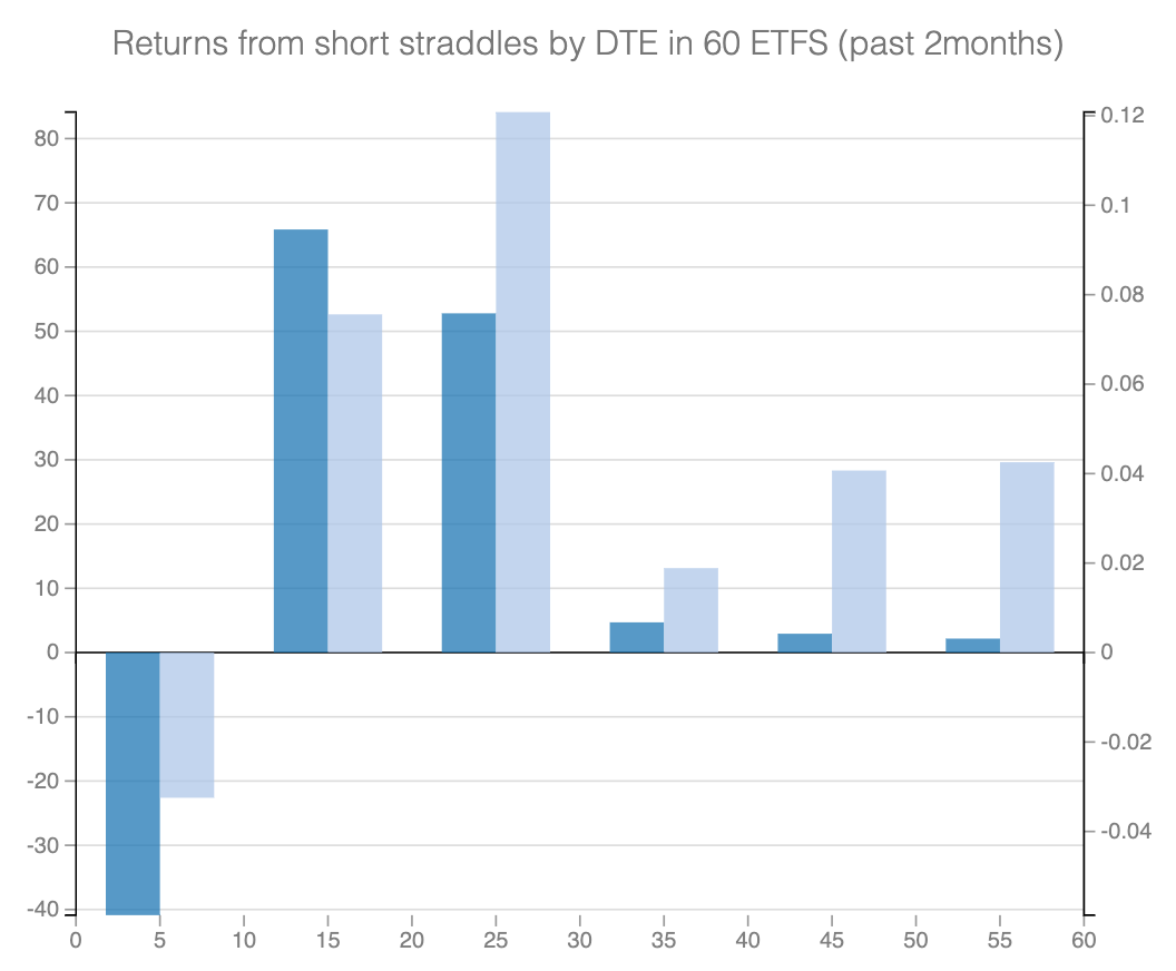 We analyzed the average returns from selling straddles in these underlying and holding them until expiration. The results are categorized by the days to expiration at the time of the trade.