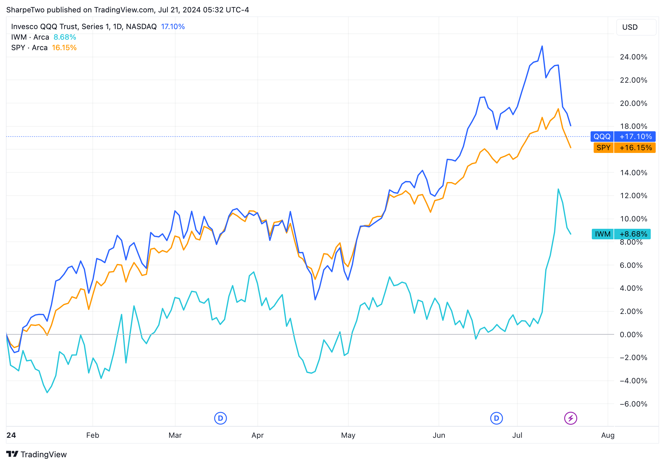 Right now, it feels like fund managers are favoring small and mid-caps over tech and AI, especially after Trump’s recent comments on big tech, particularly semiconductors. Despite taking a leg down like the entire equities sector this week, is there a scenario where IWM closes the gap with the SPY and QQQ?