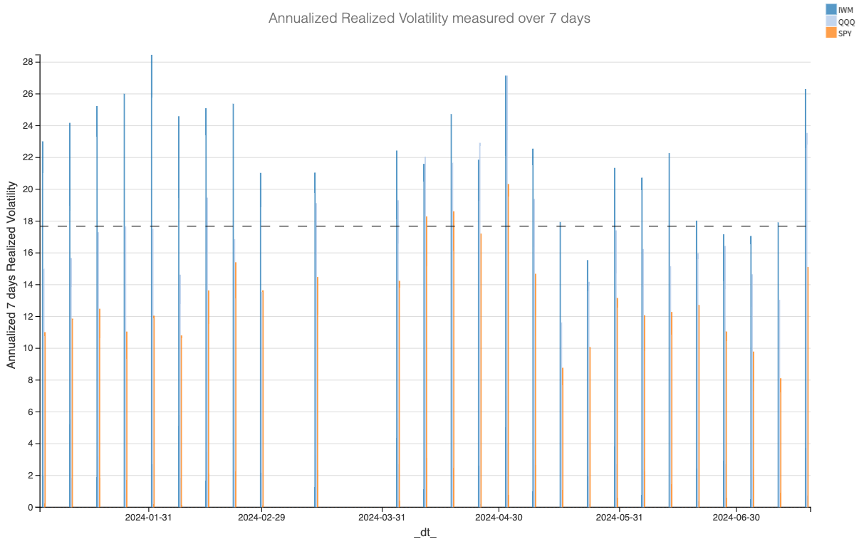 But let’s focus on their volatility. Remember the craziest week of the year so far when rockets were flying between Iran and Israel? This week's realized volatility levels have finally caught up to those levels in QQQ and IWM. SPY still has a little way to go.