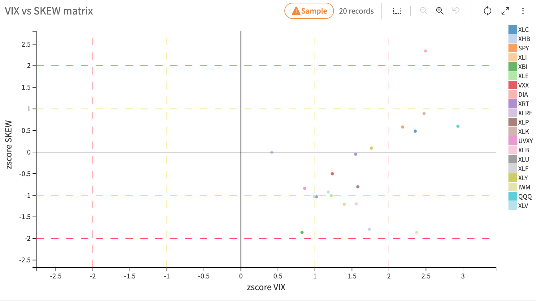 This time, we add the skew to the picture and look for abnormal puts buying versus calls. The only ones in the quadrant with high volatility and a slightly more tilted skew than usual are XLK, XLC, QQQ, and SPY. Oh, and right there at the top with a tilted skew? DIA, influenced by the weight of MSFT and AMZN, which are due to report this week.