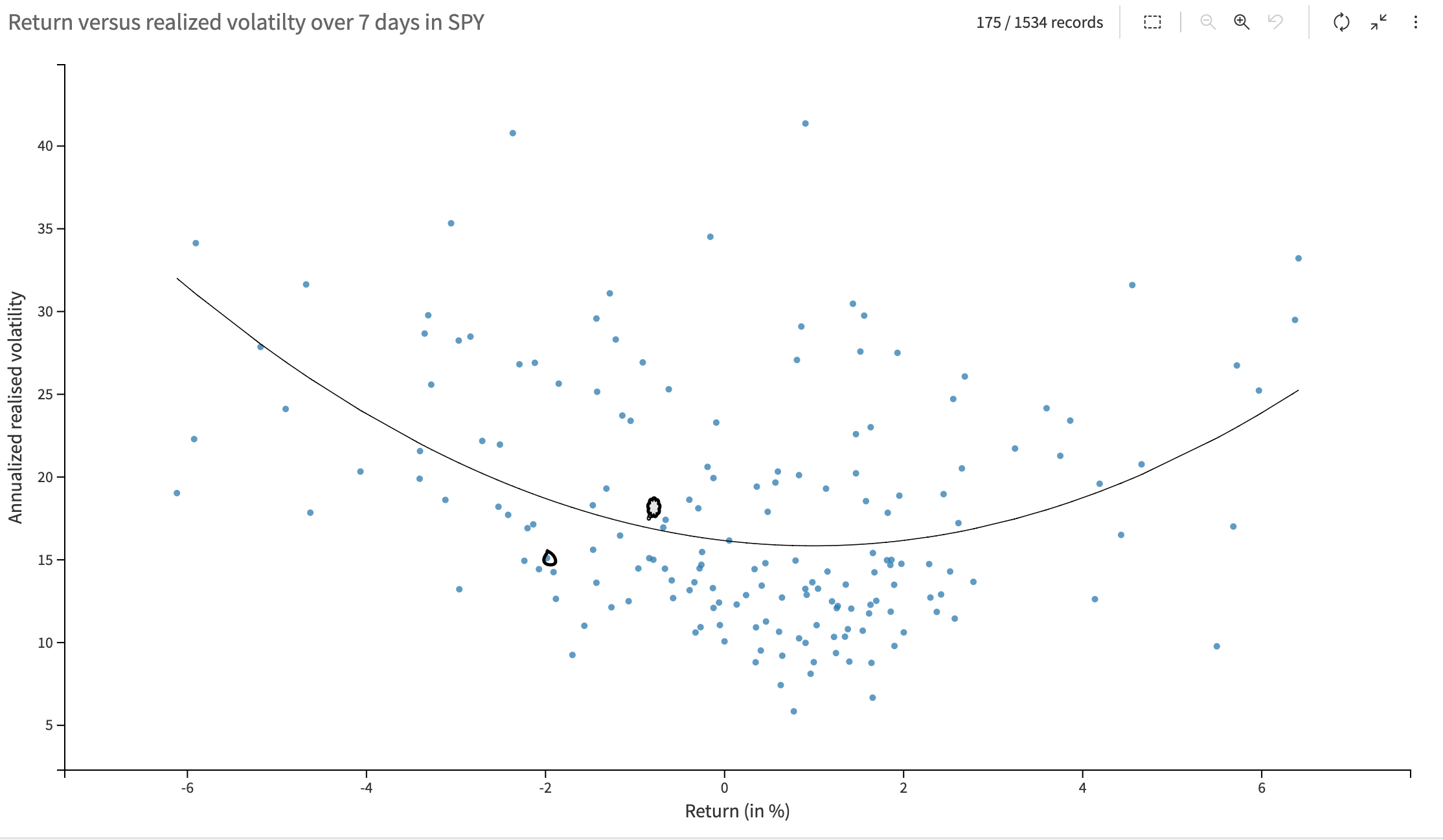 Here is a chart showing the realized volatility over seven days versus the returns in the SPY since 2020. The general idea is that volatility tends to rise when you see abnormal movement in the index, which is normally more pronounced on the downside. Do you see two little black dots close to the (questionable) polynomial fit? The one above was the point for this week where we realized 18 and lost about 1%. The other one was from last week.