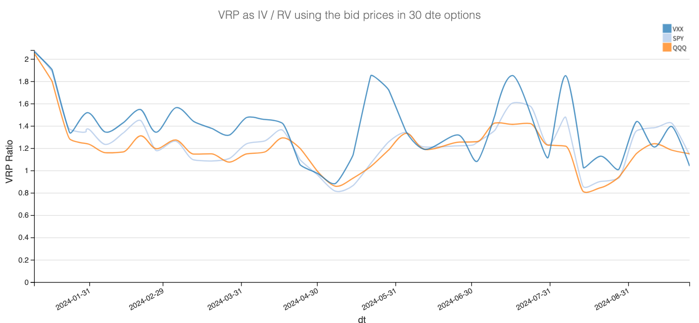But who knows? With rising tensions in the Middle East, there’s a good chance we’ll see an early continuation of the momentum in the VIX that kicked off on Friday. The VIX jumped a full point, and VVIX is now above 100. The bombing in Beirut certainly played a role, but it’s also natural for the market to start buying hedges ahead of the next 30 to 45 days, when risks are high and could linger.