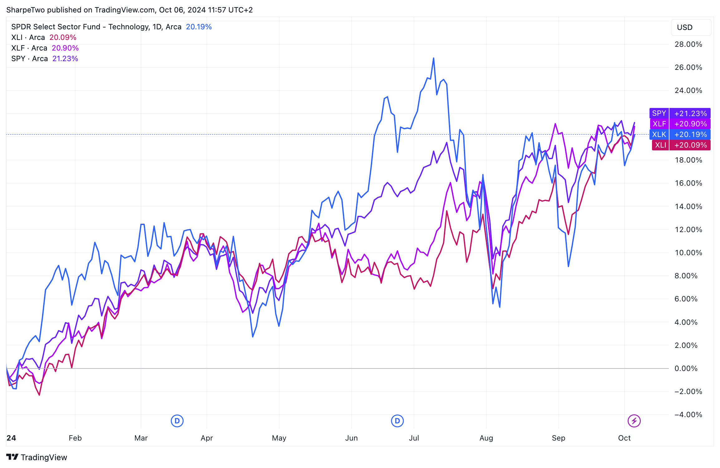 When you compare the performance of XLK, XLI, and XLF to the broader market (SPY), the answer isn’t obvious—each is still posting a massive 20% gain so far this year, with three months left in 2024.