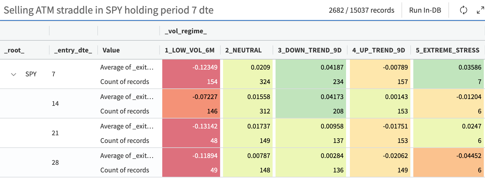 Of course, nothing quite beats the "easy money" period when volatility trends downward for extended stretches (captured as the regime down_trend_9D in the matrix below). Yet, neutral periods of volatility remain among our favorite trading conditions. Sure, you’ll occasionally get caught on the wrong side of a sudden inhale, but when the market exhales in relief, your PnL often more than makes up for it.