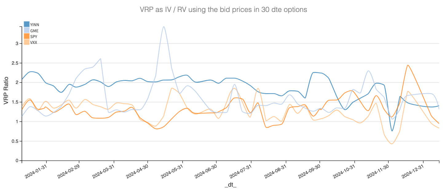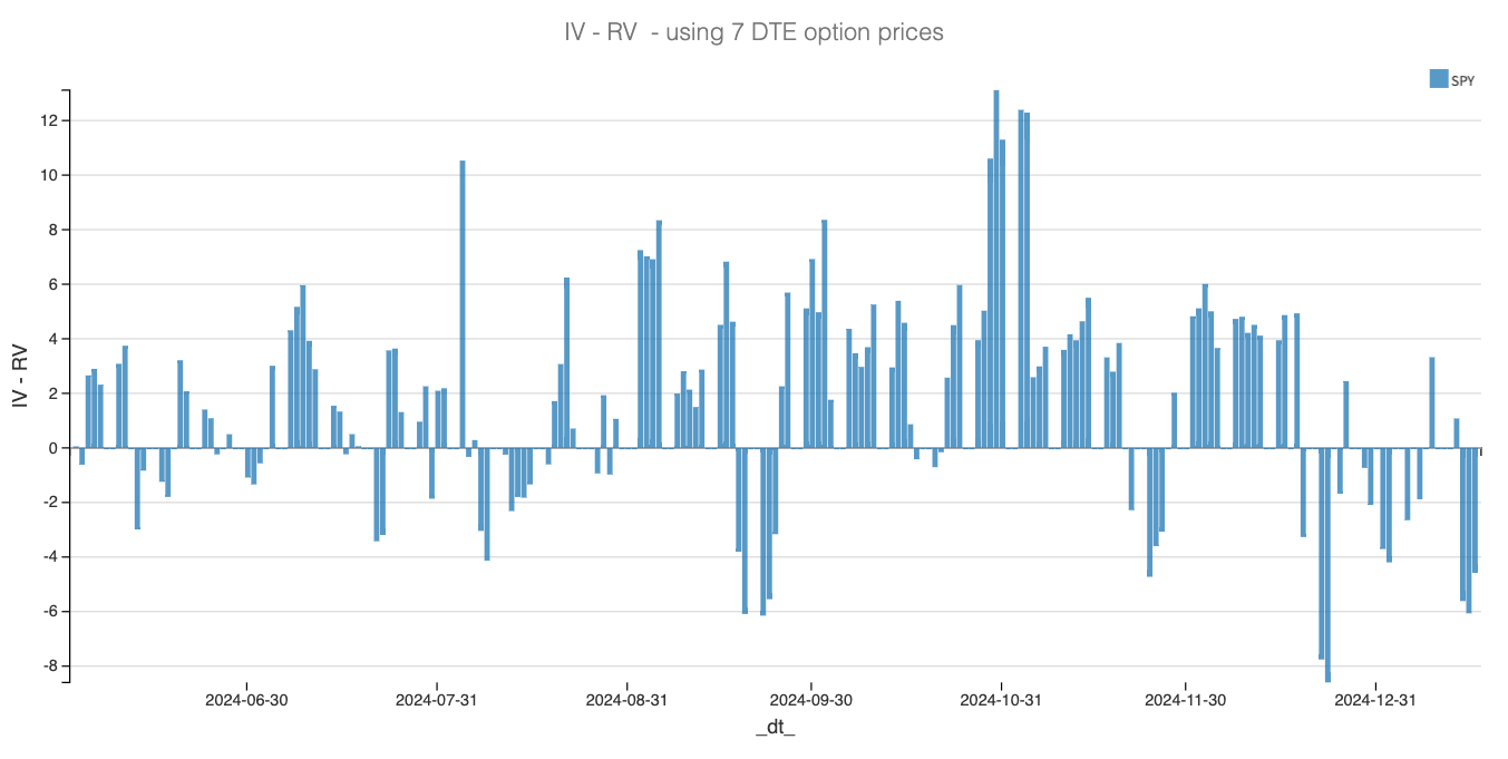 - Shorten your exposure to the front week and regularly hedge by buying wings in the back weeks or months. Ideally, for every option you sell, you should have a corresponding reinsurance contract—whether in the same underlying or in another part of the market where options are cheaper. Once again, the VRP is an invaluable guide for identifying these opportunities.