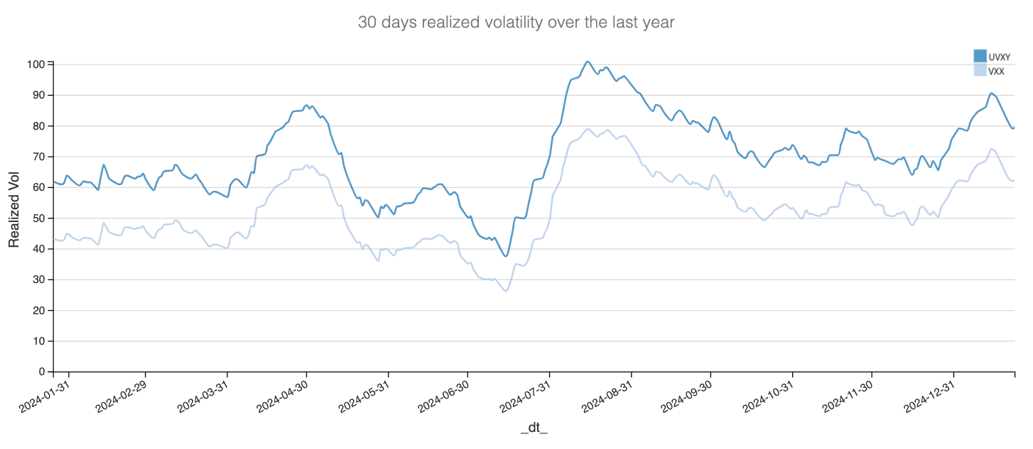 Another key takeaway is that one of our favorite trades may be making a comeback. With VVIX elevated, the VRP in VIX-related products should be materially larger than in 2024. Right now, however, that’s not entirely the case: realized volatility in VXX options at 30 days, for example, is gradually declining, and as a result, the VRP is turning positive again.