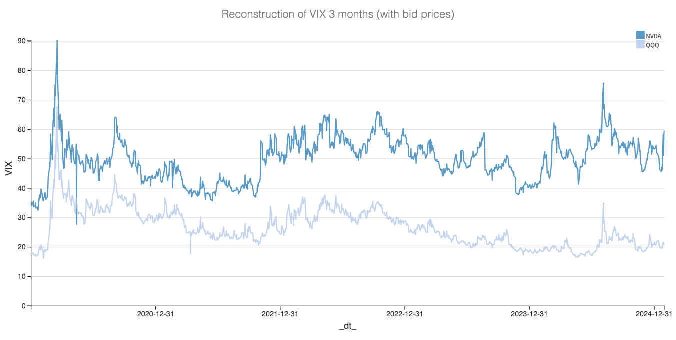 One final clue—and perhaps the most telling one: how do you reconcile the fact that three-month volatility in NVDA is pushing new highs while three-month volatility in QQQ remains near its lows? One of them is mispriced. Or maybe both.