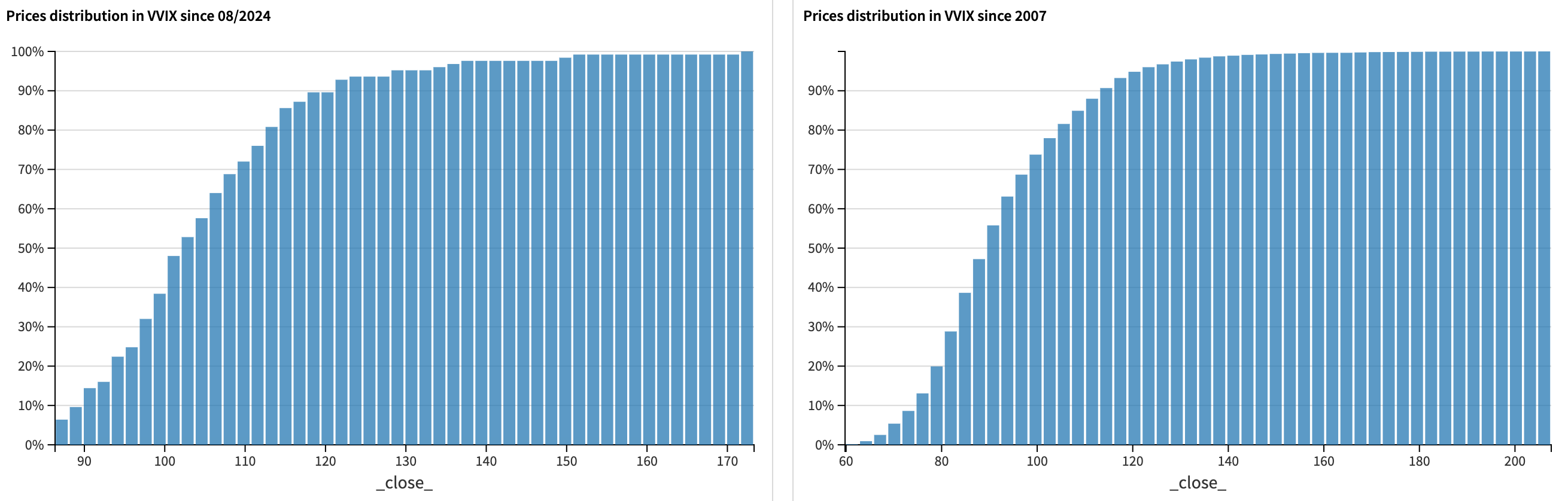 Now, let’s put this into perspective. If you compare the distribution of VVIX levels from 2007 to today, you’ll notice a clear shift in the market’s psychology. Take the 100 level—an arbitrary but relevant threshold: