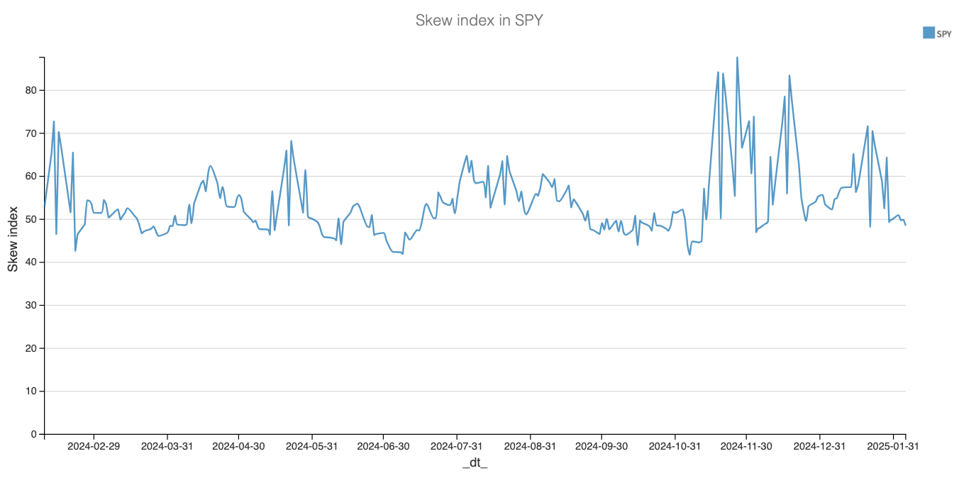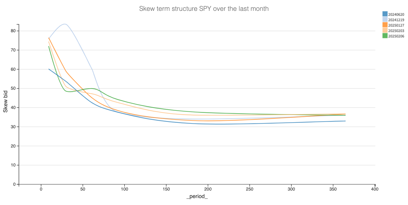The skew term structure is even more revealing. While puts were still well-bid after the FOMC and again on the Monday post-DeepSeek, that wasn’t the case this week. In fact, compared to June 2024—when markets were all sunshine and rainbows, blissfully unaware of the disruptions that would unfold over the next six months—there’s barely any difference, except on the longer tenures.