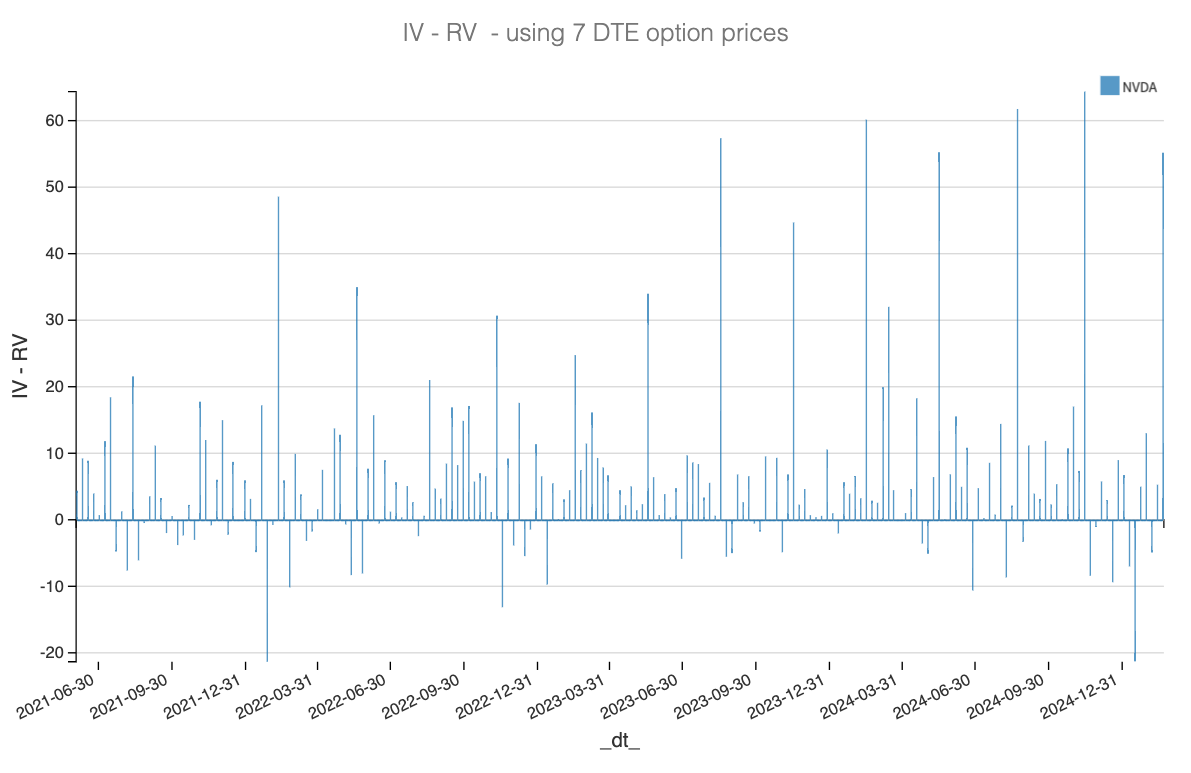 We closed at 64.5 on the 30-day VIX for NVDA, implying just under a 10% move between now and the close on Friday. The variance risk premium (VRP), using 7 DTE options, is trading at similar levels to previous earnings weeks over the last two years.