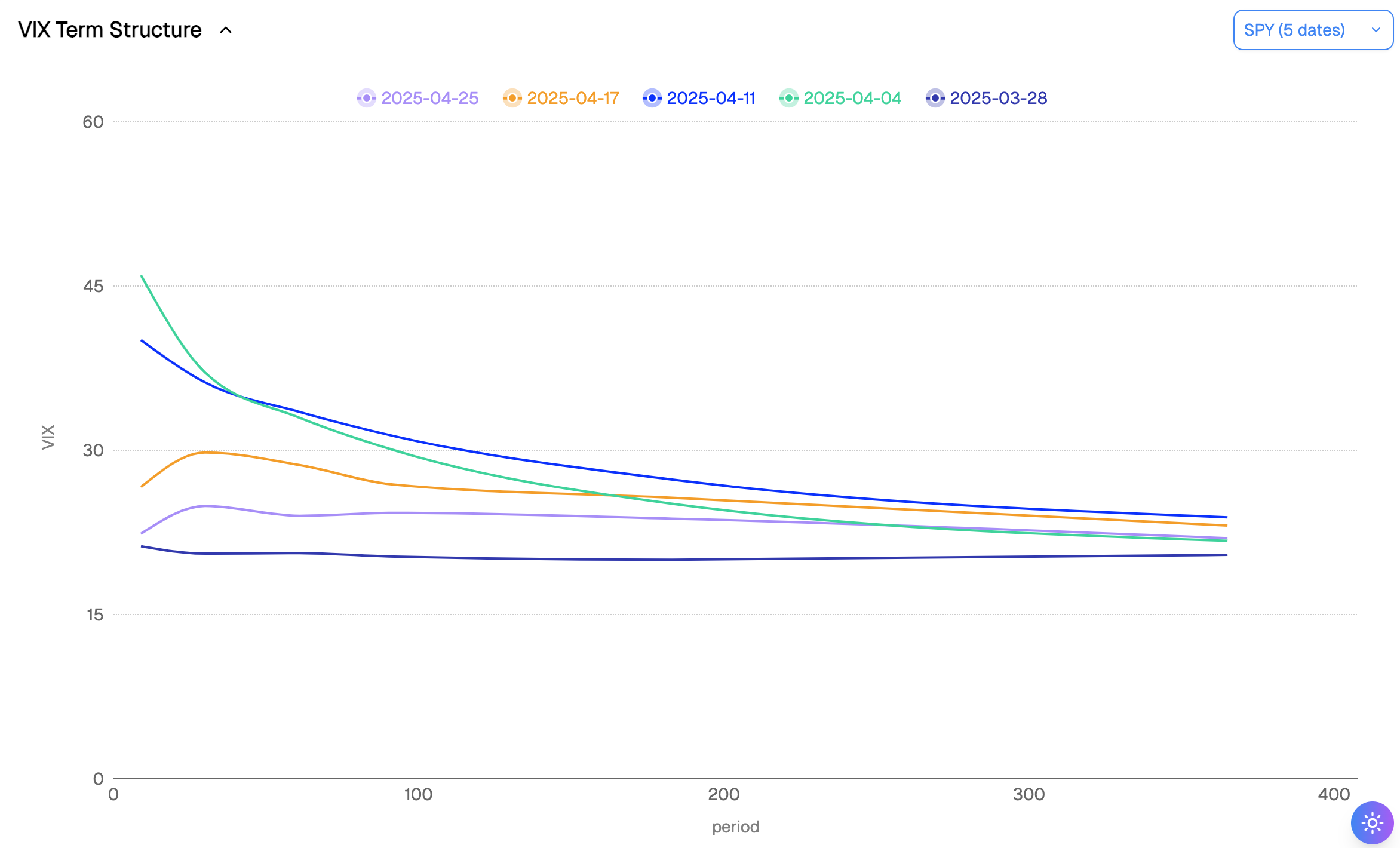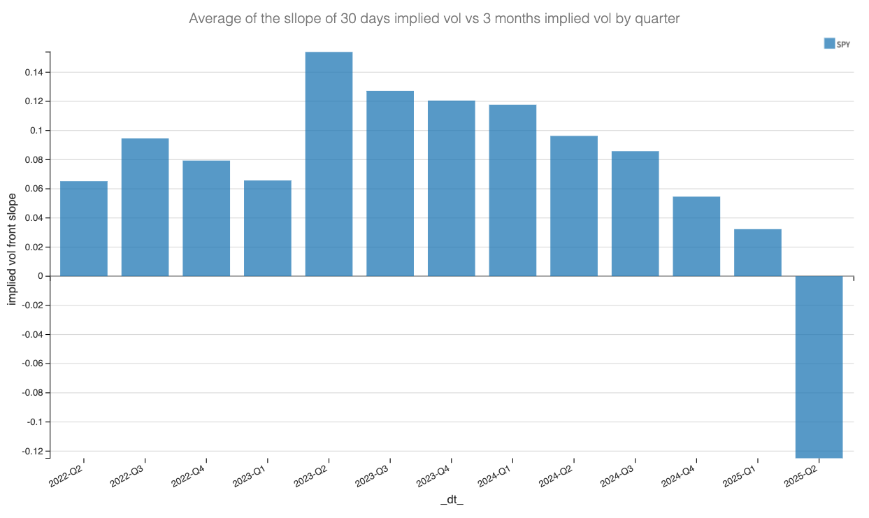 Remember: before the spike, a flat term structure was the default in the months leading into the election — and remained so after: we went from almost 12% on average in the contango between 30 days and 3 months implied volatility to a sporadic 5% in Q4 2024 and even lower in Q1 this year.