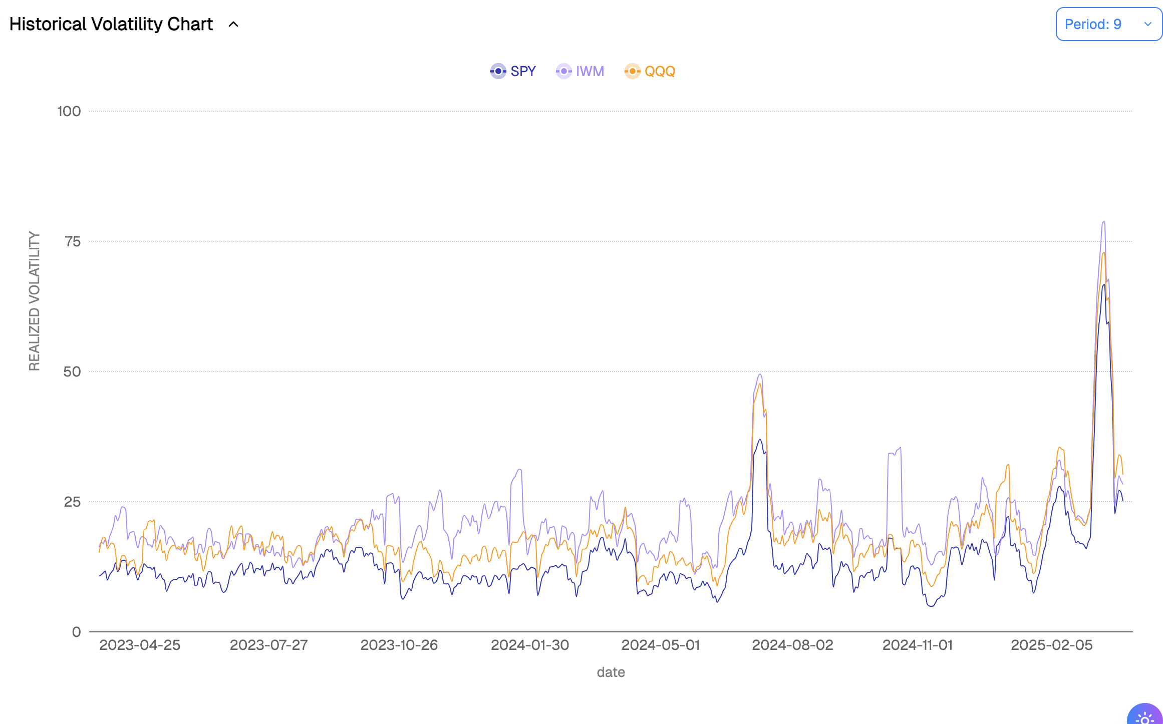 First of all, the 9-day realized volatility across the main ETFs is definitely looking better than a couple of weeks ago. We’re still at the high end of what’s been typical over the past two years — with around 25% realized in the SPY — but the trend is improving.