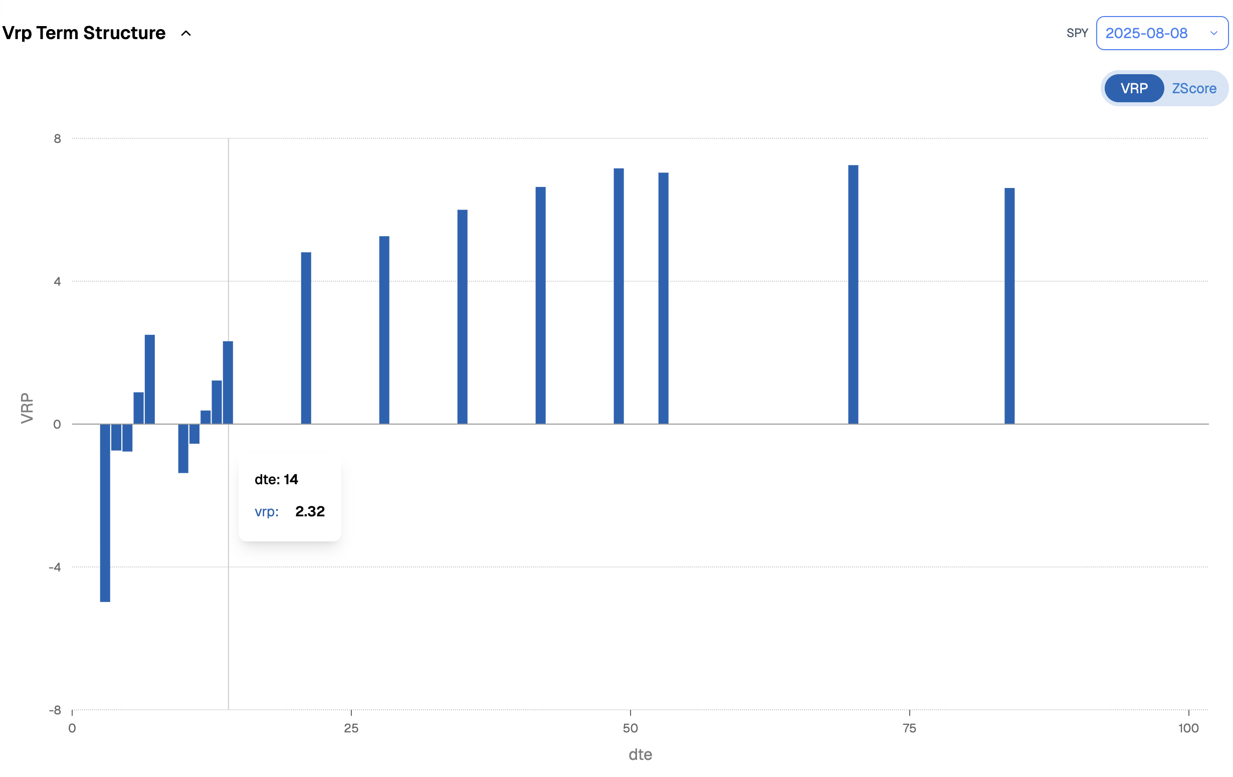 The VRP is virtually gone from the first two weeks. In other words, your edge there is getting thinner, and extracting vol without doing much (starting with delta hedging) will be harder. Even the back weeks, around 30 days out, look far less attractive than the almost guaranteed 8 points we had a month ago.