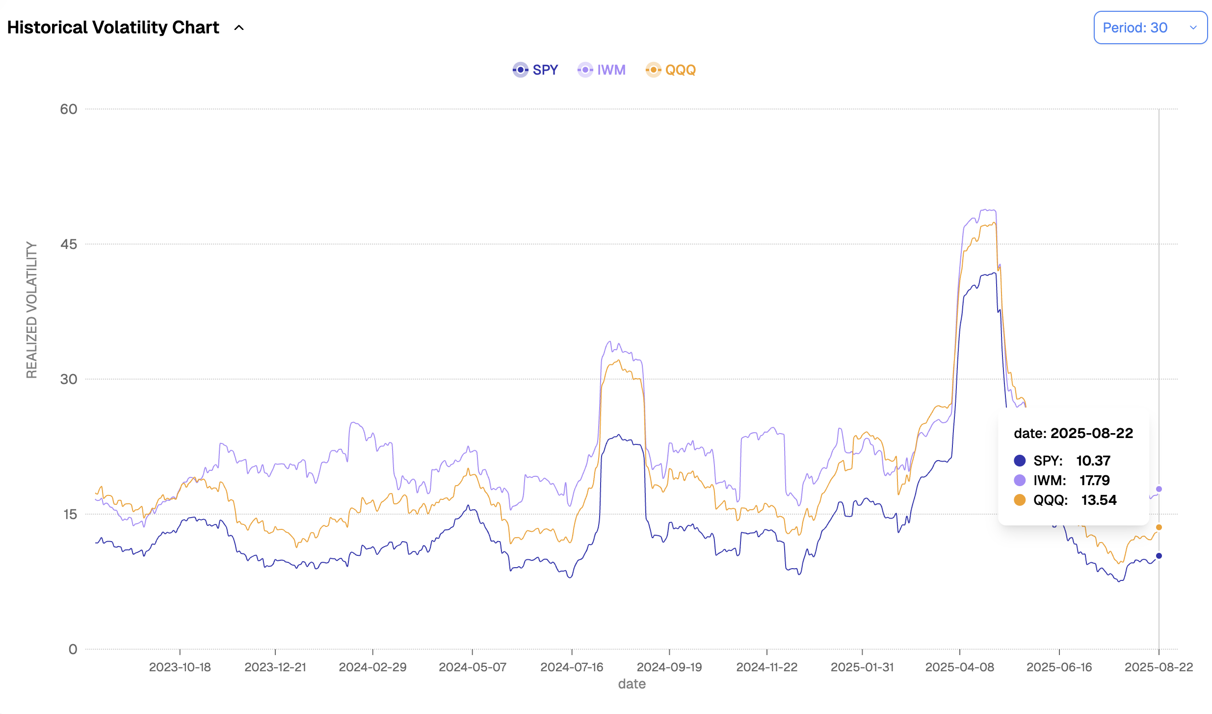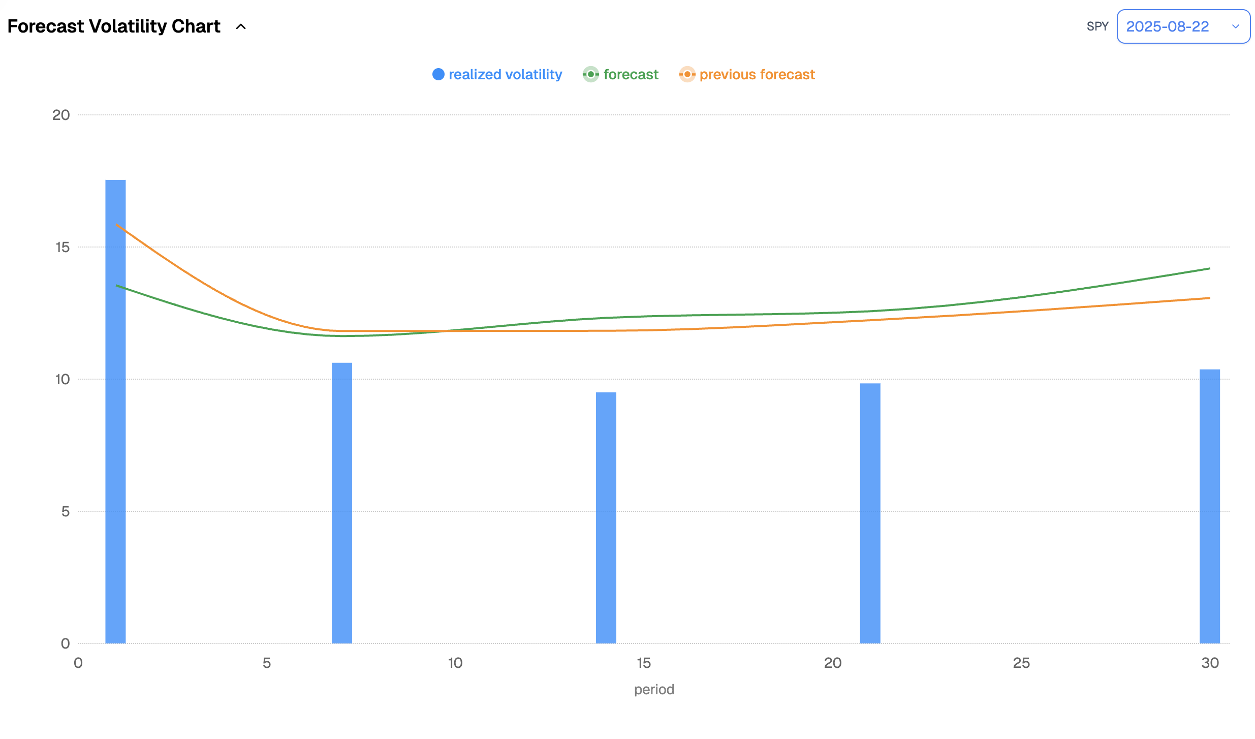 Realized volatility over the past 30 days in SPY has been 10.37%. The long-term average sits closer to 14%, and the market knows it: whatever system you run, you will find forecasts circling that 14% mark for the next month. In practice, it may turn out a little lower, given how much risk has come off the table with monetary policy now largely set for the coming months. It could also edge a bit higher. But one thing seems clear: it is not going to be 20%.