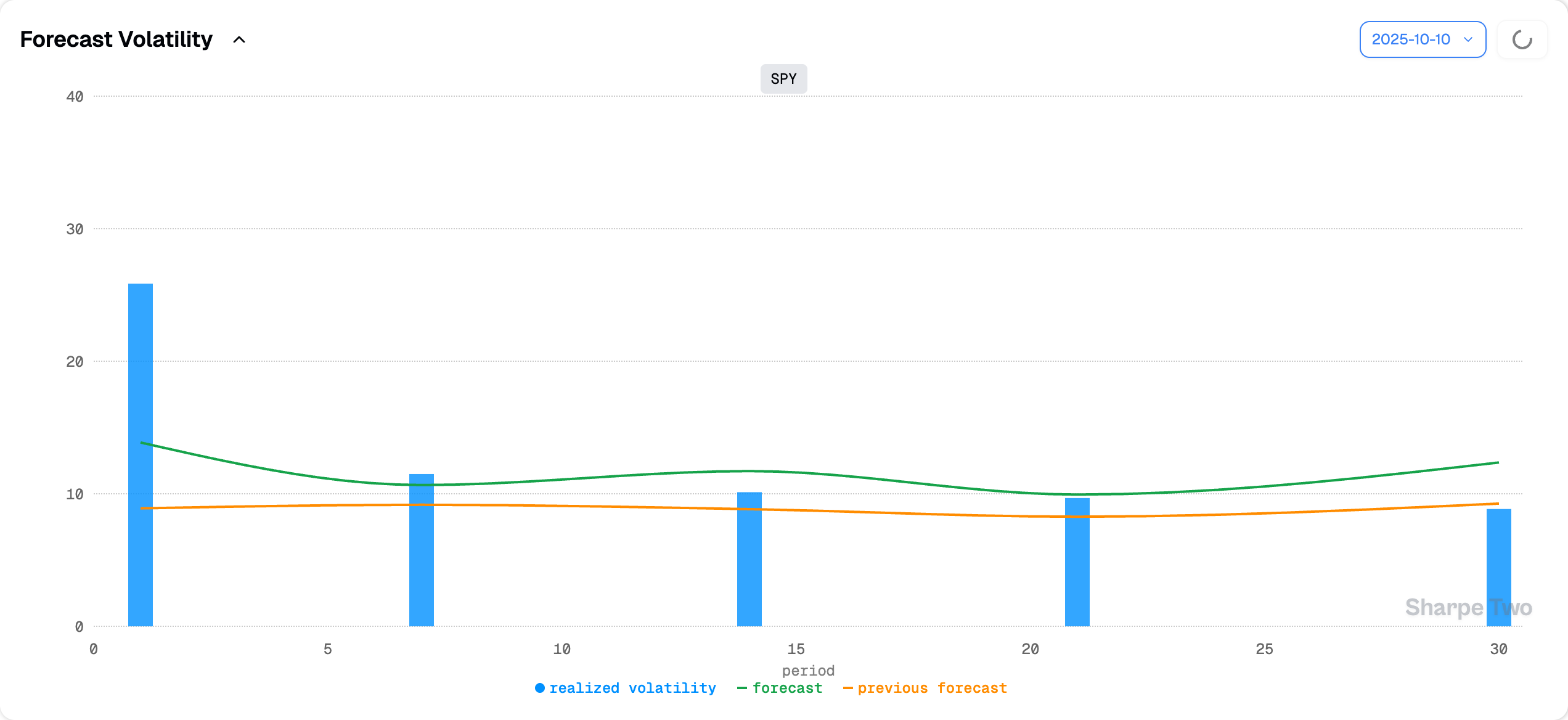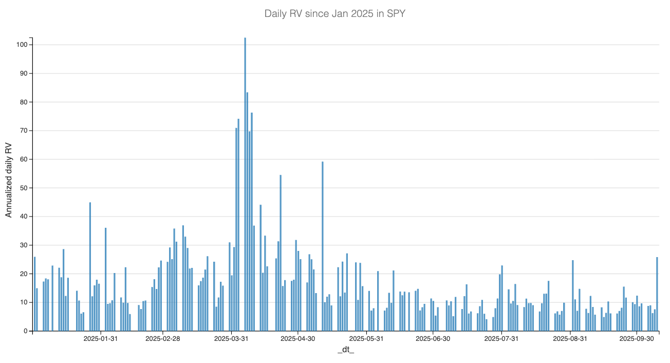 Not much has changed from last week: we are sitting around 9, with an expected move up to roughly 13 over the next 30 days. We know this model tends to lag a little and capture more of the long-term average. But let us imagine things really start to heat up — realized vol jumps from 9 to 15. That would mark a dramatic regime shift compared to the past month. For that to happen, we would need to see daily realized variance consistently running between 15 and 20 for at least two weeks straight.