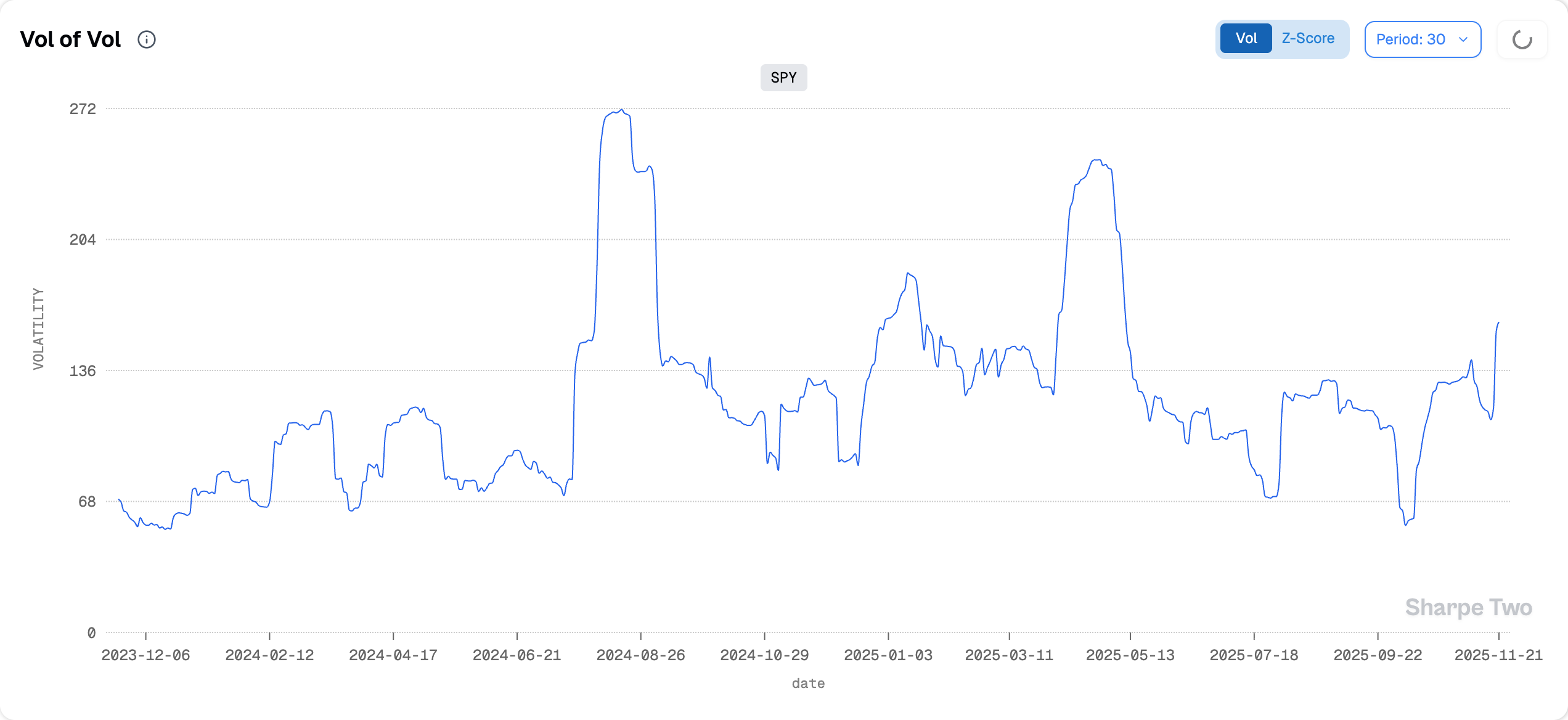 Back to the data. Vol of volatility is still climbing and is now at levels similar to what we saw throughout Q1 in the run-up to the tariff policy. Yet we are still below early January, when the market was digesting the rather odd December 2024 FOMC meeting that sparked an unexpected jump in volatility.