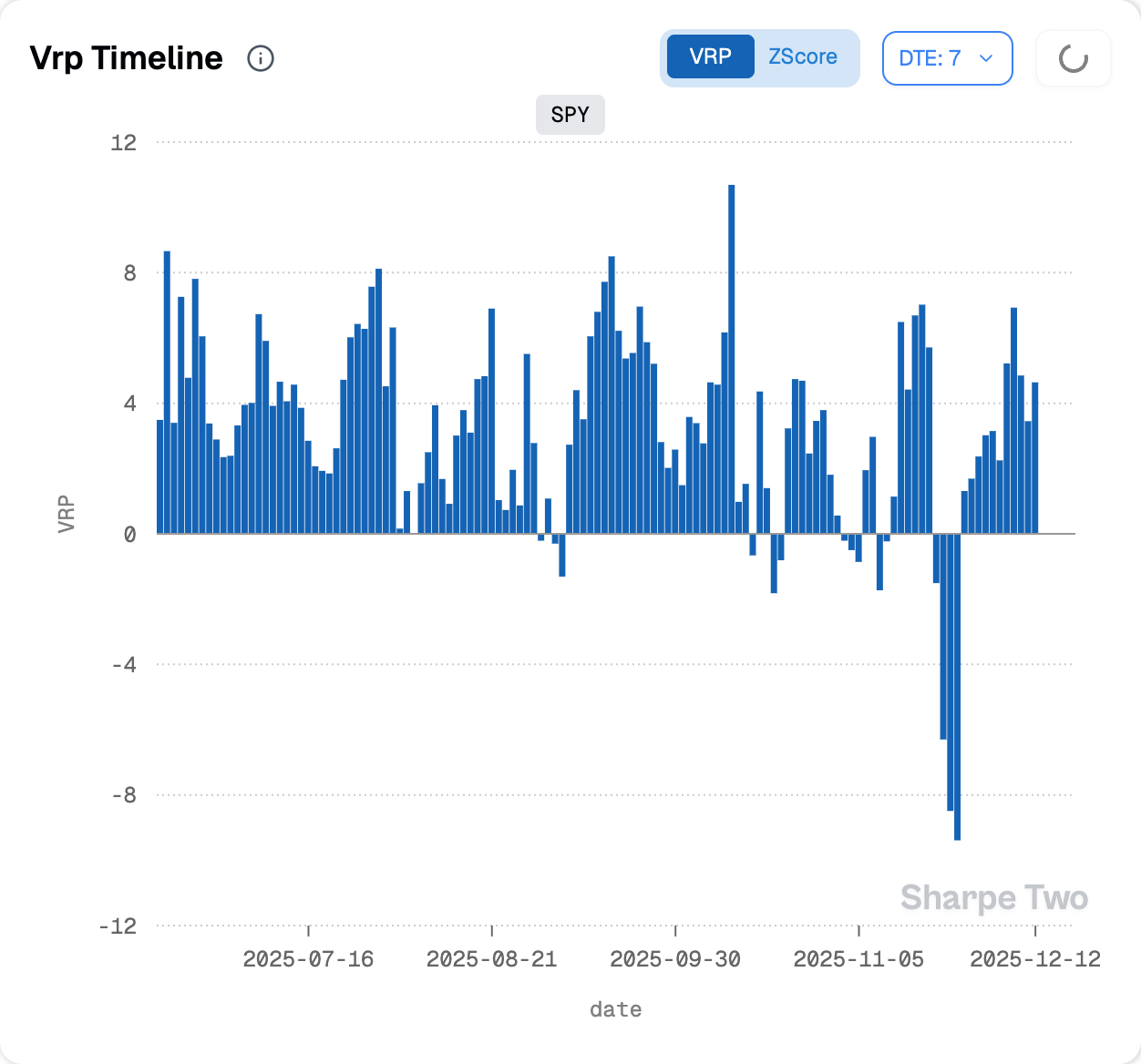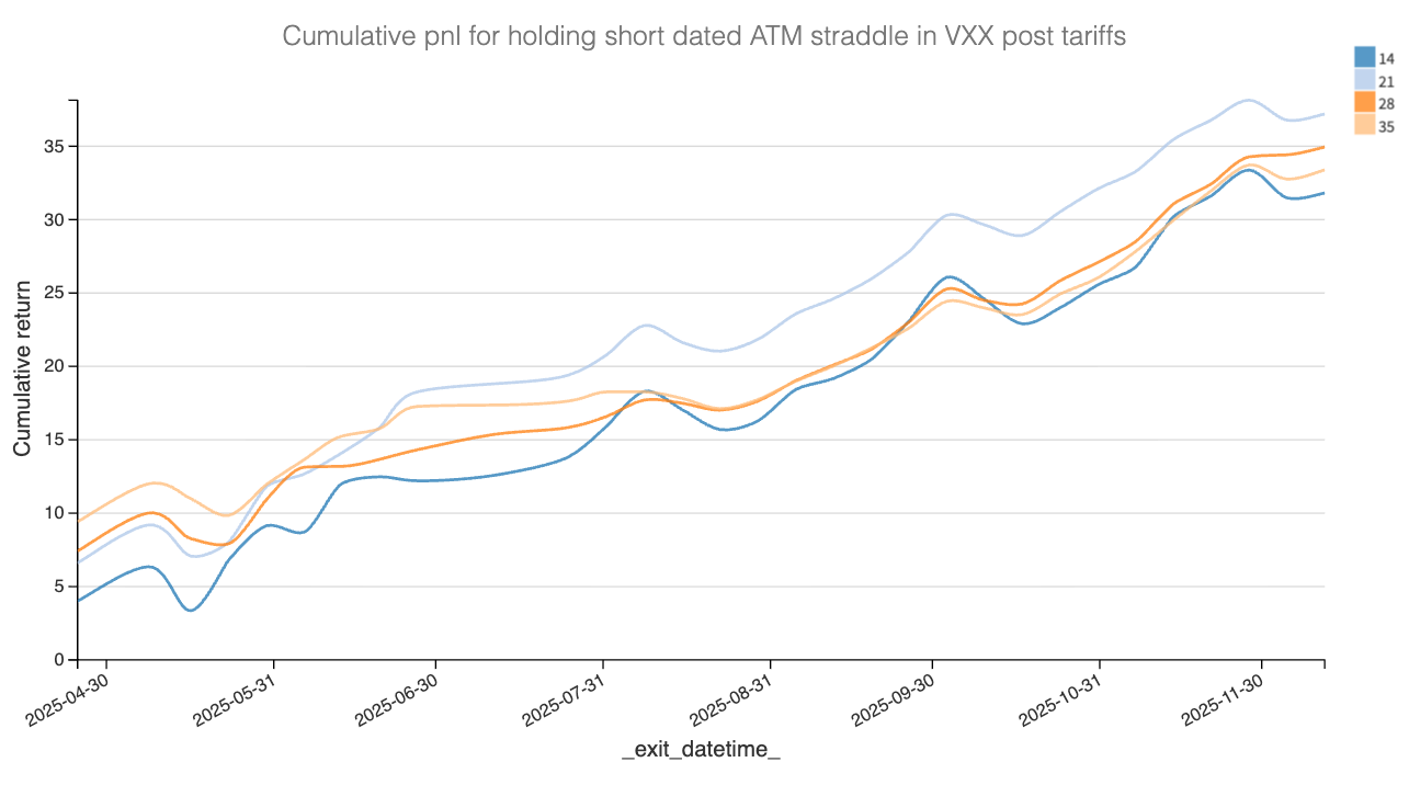 In 2025, once the tariff story imploded, you saw us take a step back on the term structure and focus on the 30 dte area, where the gamma risk was lower. After all, we trade our own money and wanted some protection from another salvo of Trump manip… sorry, folly. Yet the chart above says it all. You consistently had at least 3 points of VRP, and sometimes much more, concentrated in the very front week in SPY.