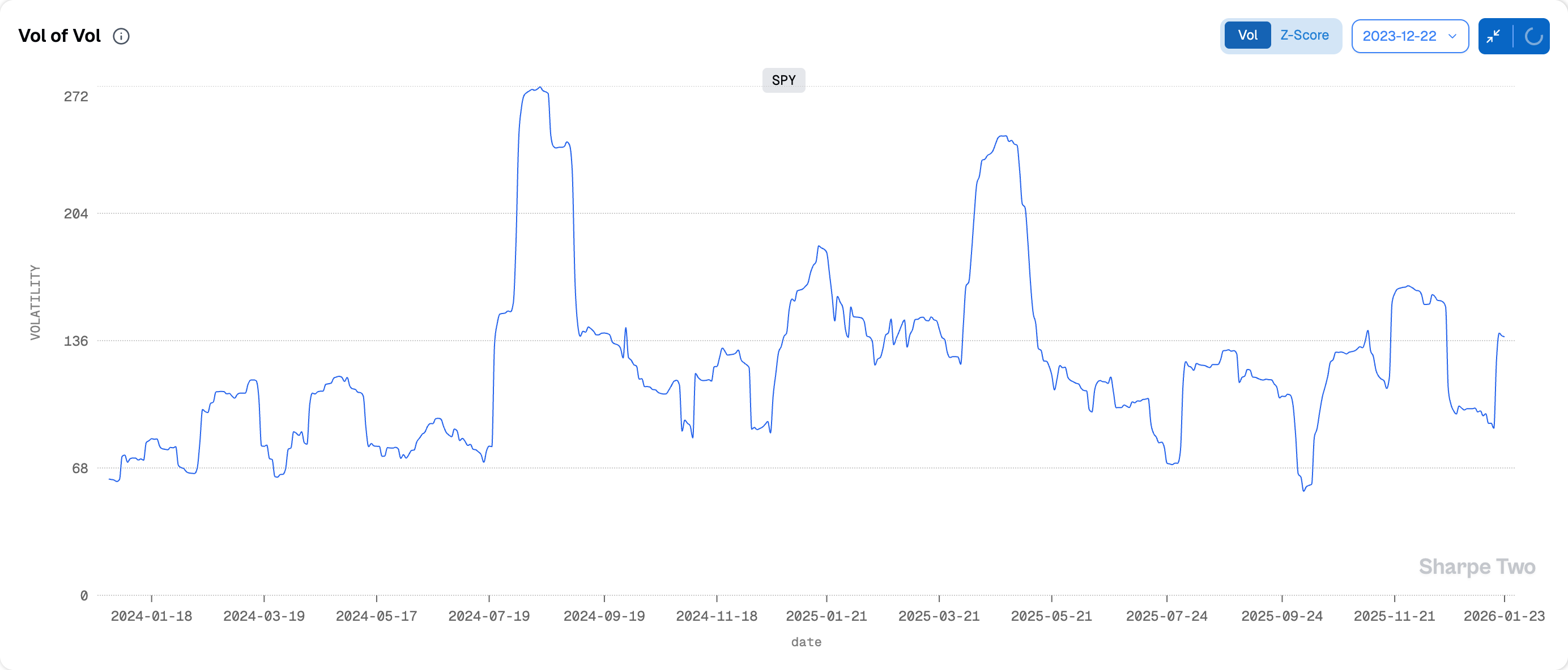 Let’s look at the volatility of volatility (vol-of-vol). It has climbed back to last October’s levels, and while still slightly under November’s highs, it is on the higher end of the range we’ve seen over the last two years. Until further notice, do not be surprised to see the VIX jump 3 or 4 points in a single session.