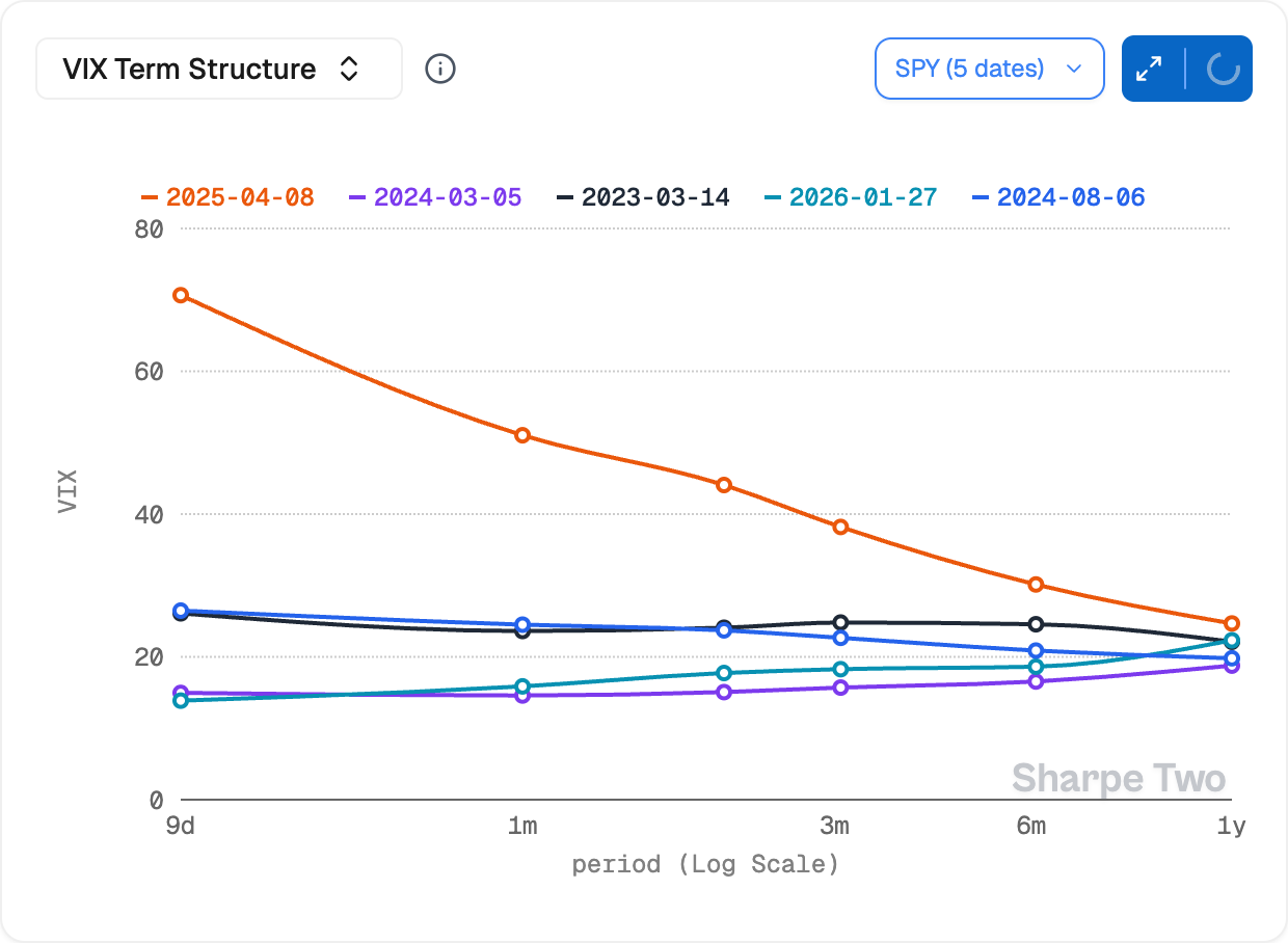 We brought these term structure charts, exploring a few different periods of recent history, to make the point as clear as day: if you did not buy short-term options ahead of time, you need a serious continuation of the crisis for them to be useful. Otherwise, they will bleed value as time passes — especially now, when realized volatility has not yet caught up. And precisely because realized vol is still somewhat in check, the options at three to six months out remain the ones best positioned to absorb a serious increase in volatility. Their value will not change much on entry nor on exit, you can size up a little, and they may prove useful regardless over the coming months.