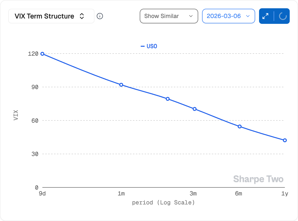 The volatility at 6 months is also nearing 60%; there is a legitimate case where you take all your oil positions and recenter them to 6 months from now and forget about it. And if you needed some sort of hedge or relief, you could buy the one year out. That backwardation is one of the steepest we’ve seen, and while it could stay like this, a normalization would see the 6 months react much more than one year out.