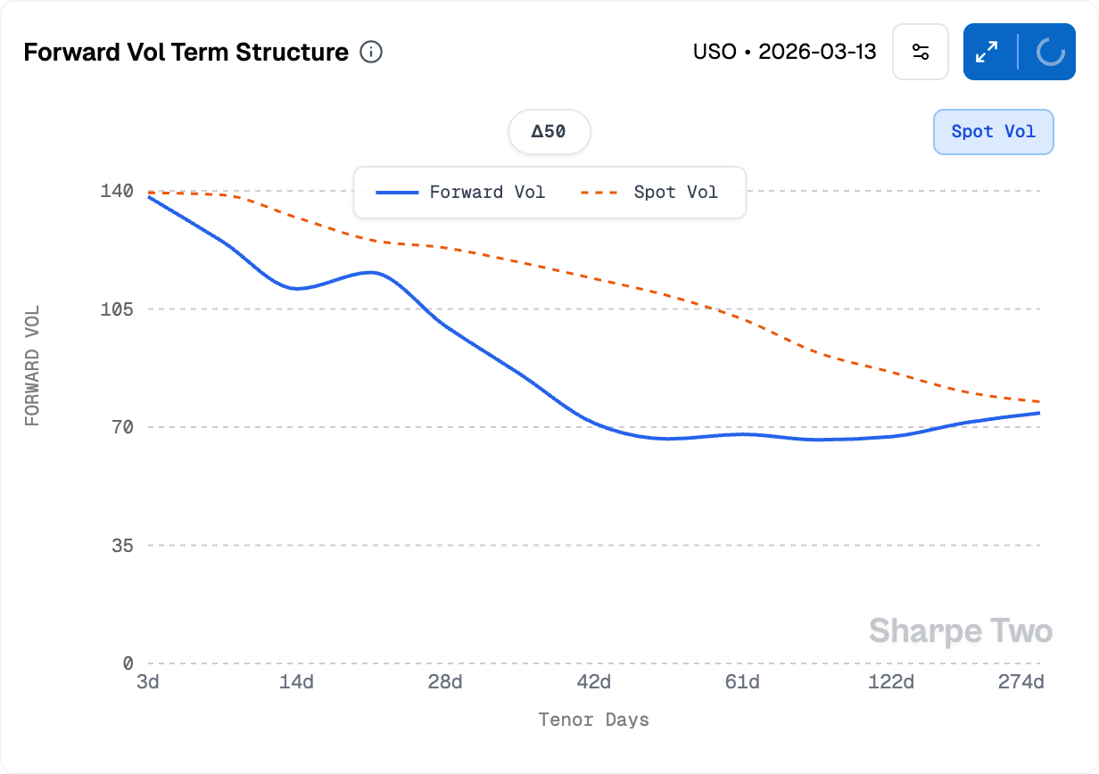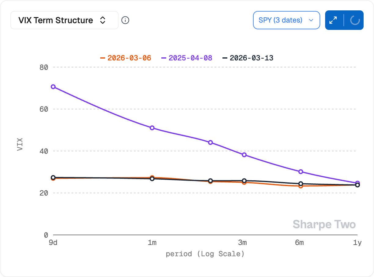 The term structure is pretty much identical to where we’ve left it a week ago. This means once more that if you have some trades in the April contract, you can still roll and recenter further out on the term structure at pretty much the same level of implied volatility. This is a great way to go find shelter while waiting for things to pass. We still think buying the back months to transform a short strangle into a calendar structure has value: better safe than sorry, because if an episode similar to April last year were to strike, the 3-month implied vol still has a lot of room to expand: yes, it can absolutely go to 40, almost overnight with very limited ability to do anything about it.