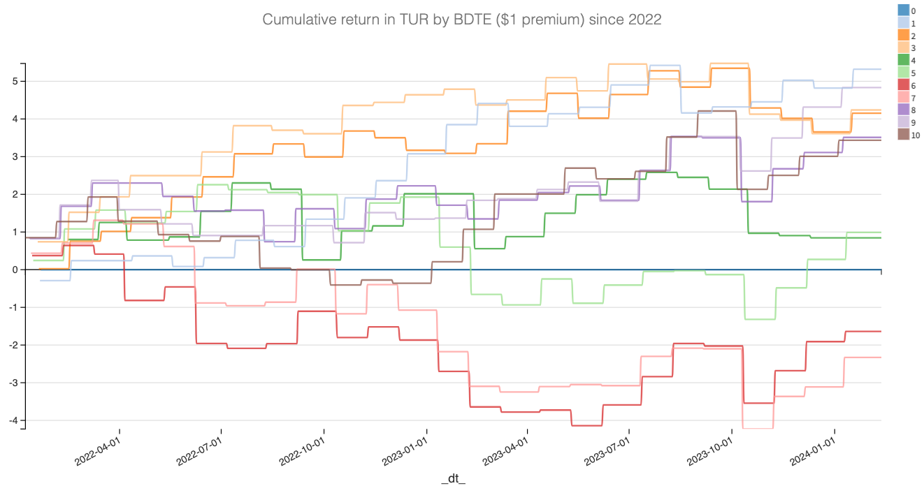 It's noteworthy that positions opened 0 and 1 business day to expiration (bdte) yield comparable results to those initiated two weeks prior. This observation reaffirms the strategic timing of fund managers seeking to hedge.