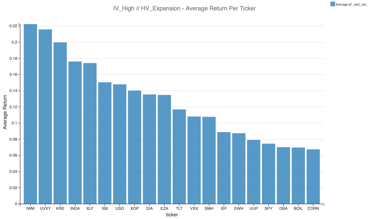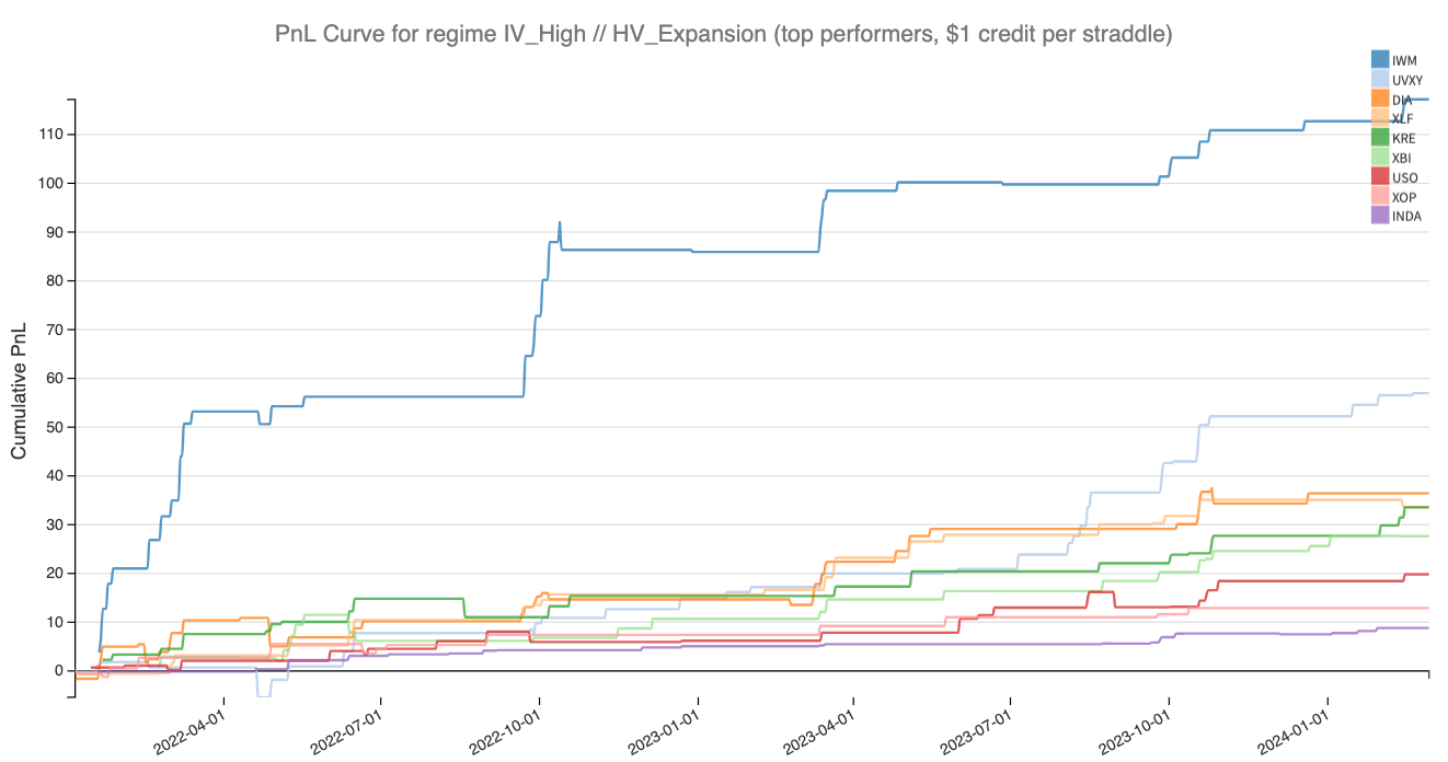 From there, we've focused on one of the best setups in the mix, characterized by IV_High and HV_Expansion. This setup yields an average of 7% per trade without any extra work, and the PnL looks pretty solid.