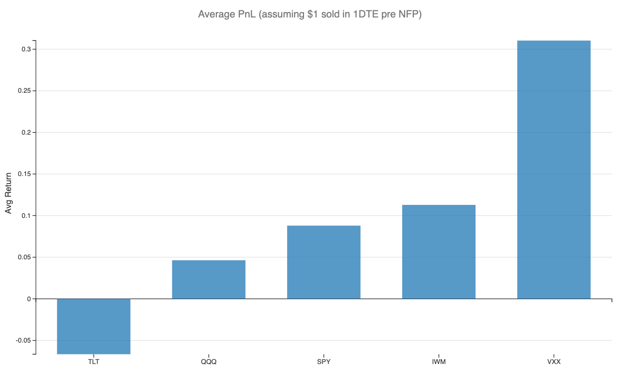 Let's review data on how much insurance costs in major indices overstate the actual movement in the underlying. To that end, we will compare the returns on straddles sold on Thursday before the NFP and closed at the end of the day on Friday.