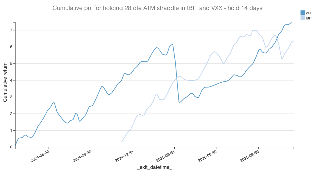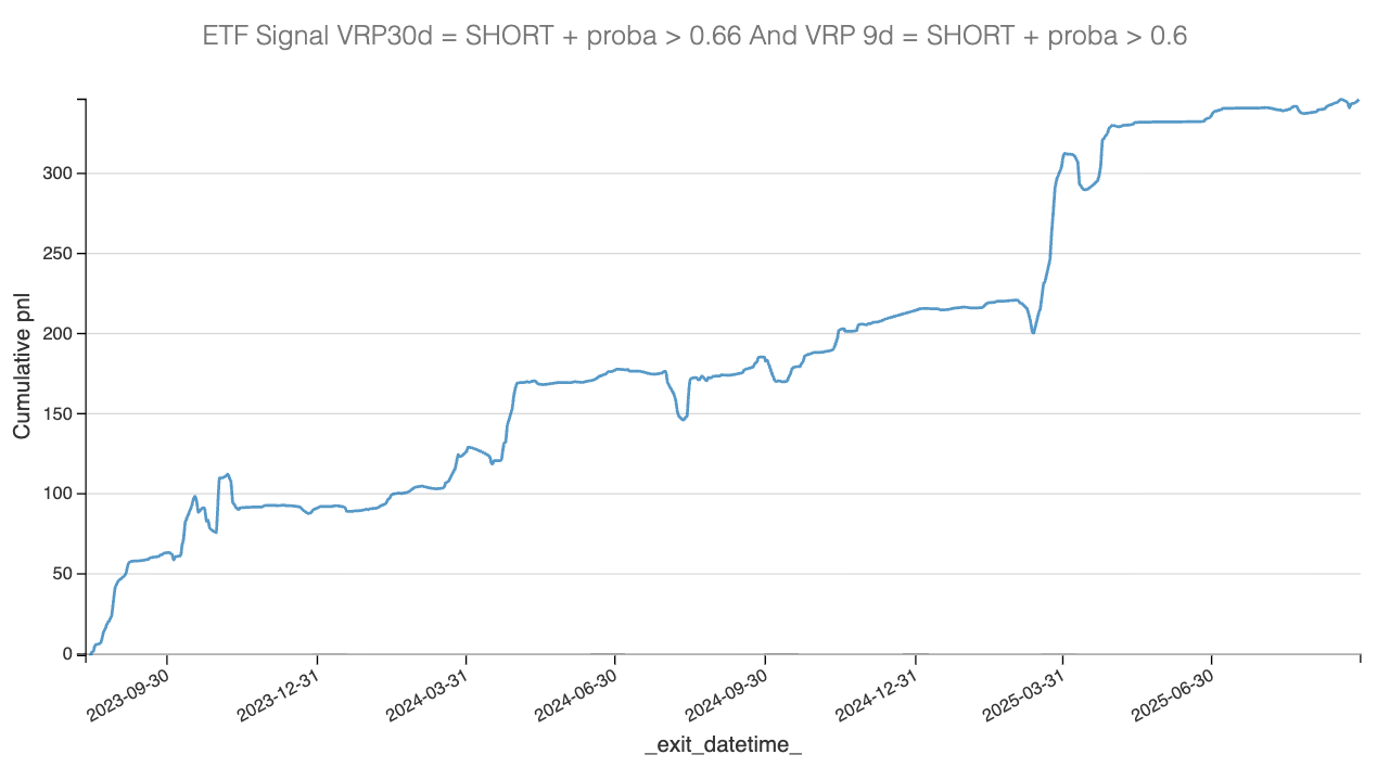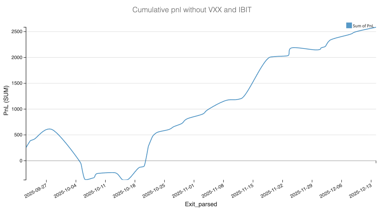 We also had a few trades in IBIT, and it is true that the variance risk premium there is so strong that one could argue these trades may introduce a positive bias into the results. Yet the equity curve keeps a very strong visual message.