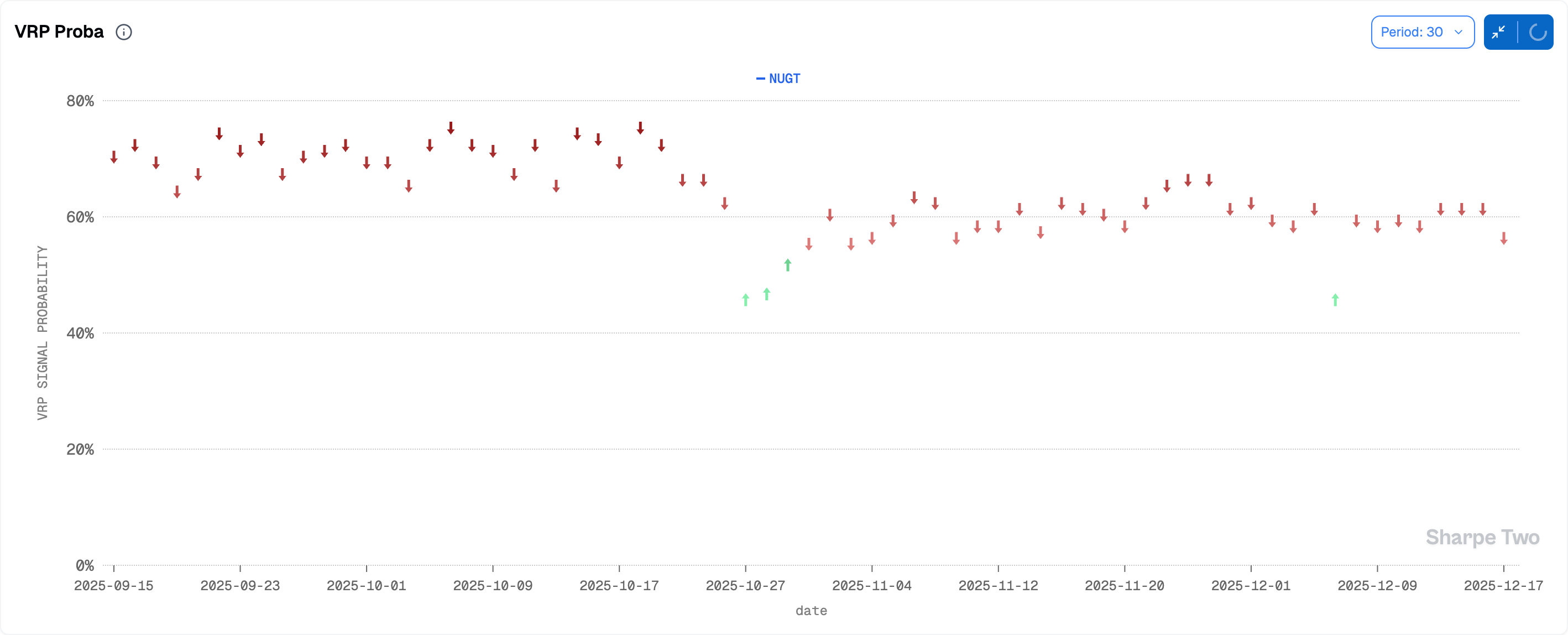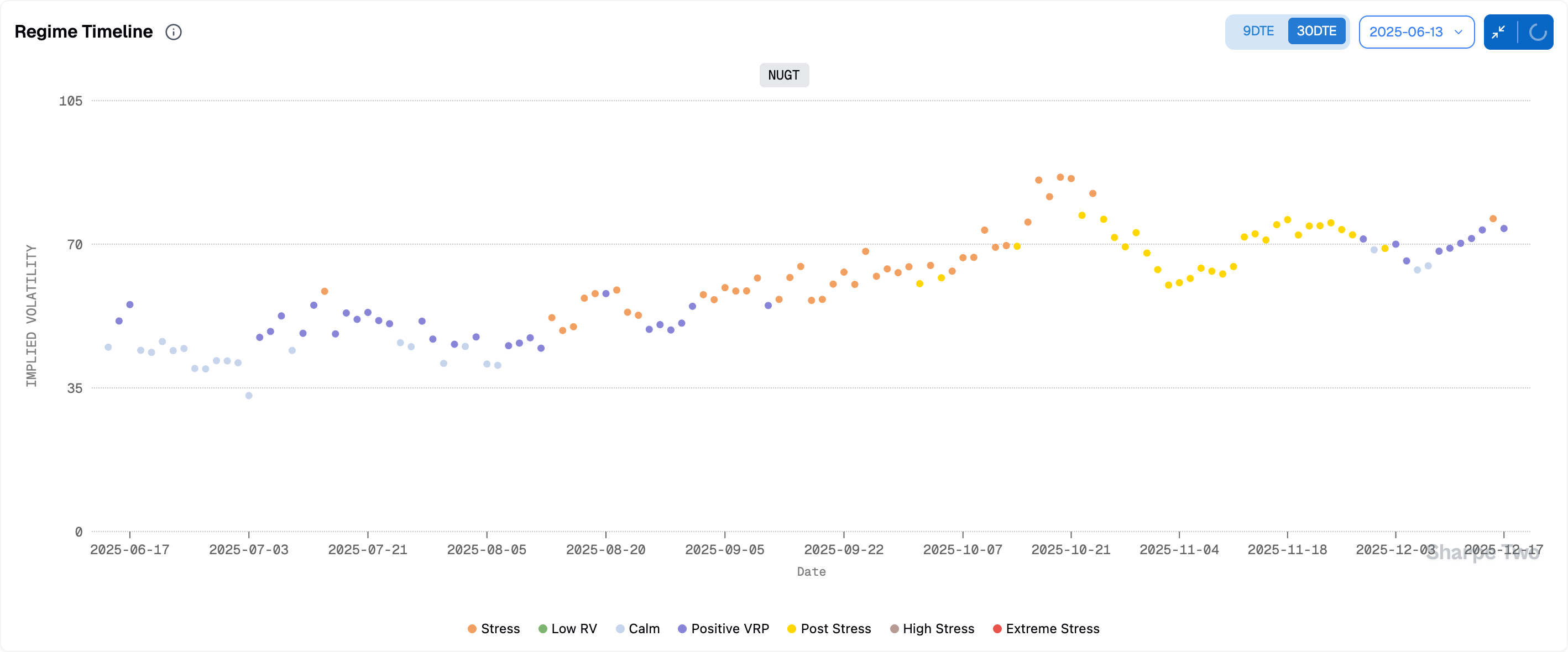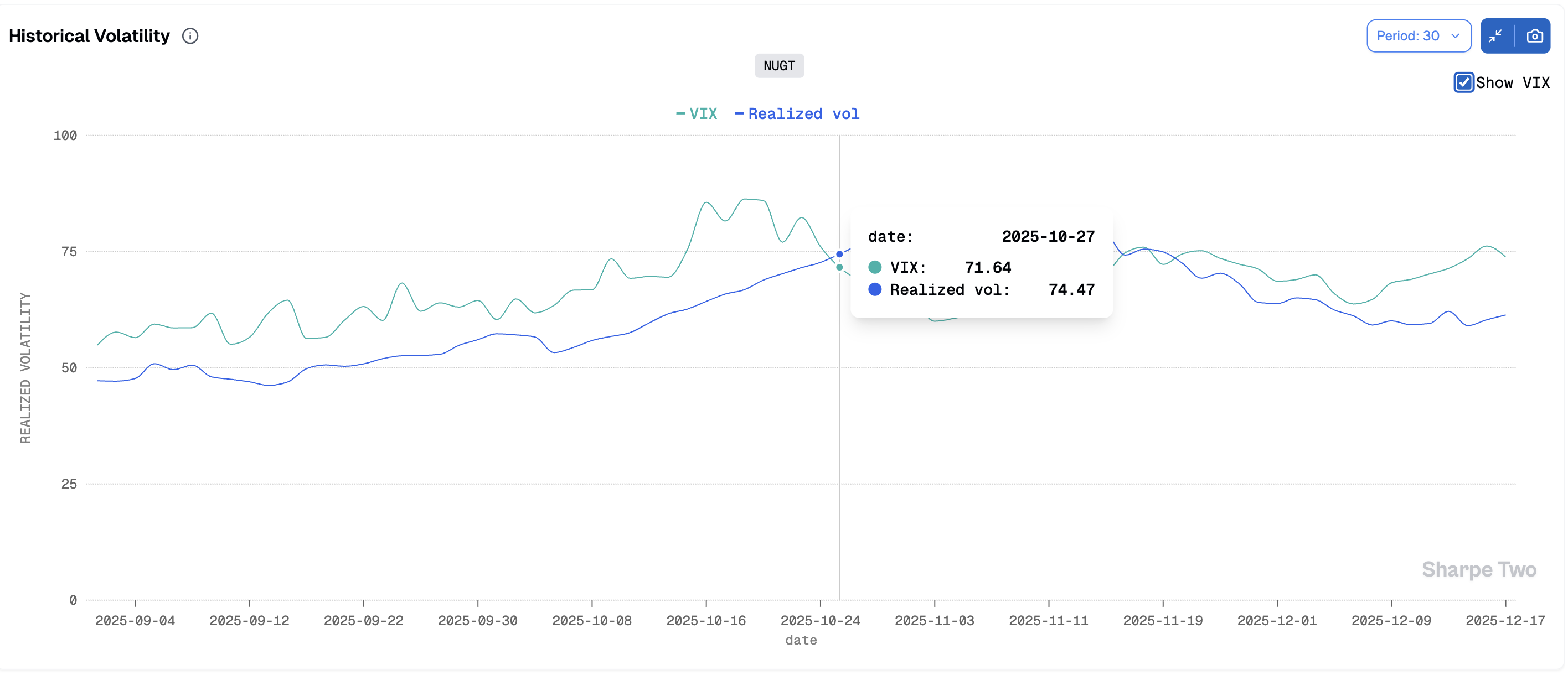 In our case, the biggest loss came from NUGT, the leveraged ETF tracking junior miners. While the signals were strong throughout September and into a good part of October, the relentless upward push in gold meant that the position increasingly resembled a short on the gold sector rather than a pure variance premium harvest. In Greek terms, gamma was inflicting far more daily damage than vega and theta could offset. To make matters worse, implied volatility itself was not cooperating, creeping higher day after day.