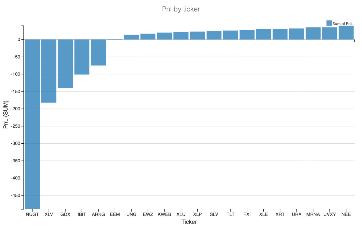 In the end, once we put the gold sector aside (NUGT and GDX are essentially the same trade), we experienced some headwinds mainly in XLV, ARKG, and IBIT, mostly in October, when the market was caught off guard by Trump’s comments on China, followed by Powell’s surprisingly hawkish tone.
