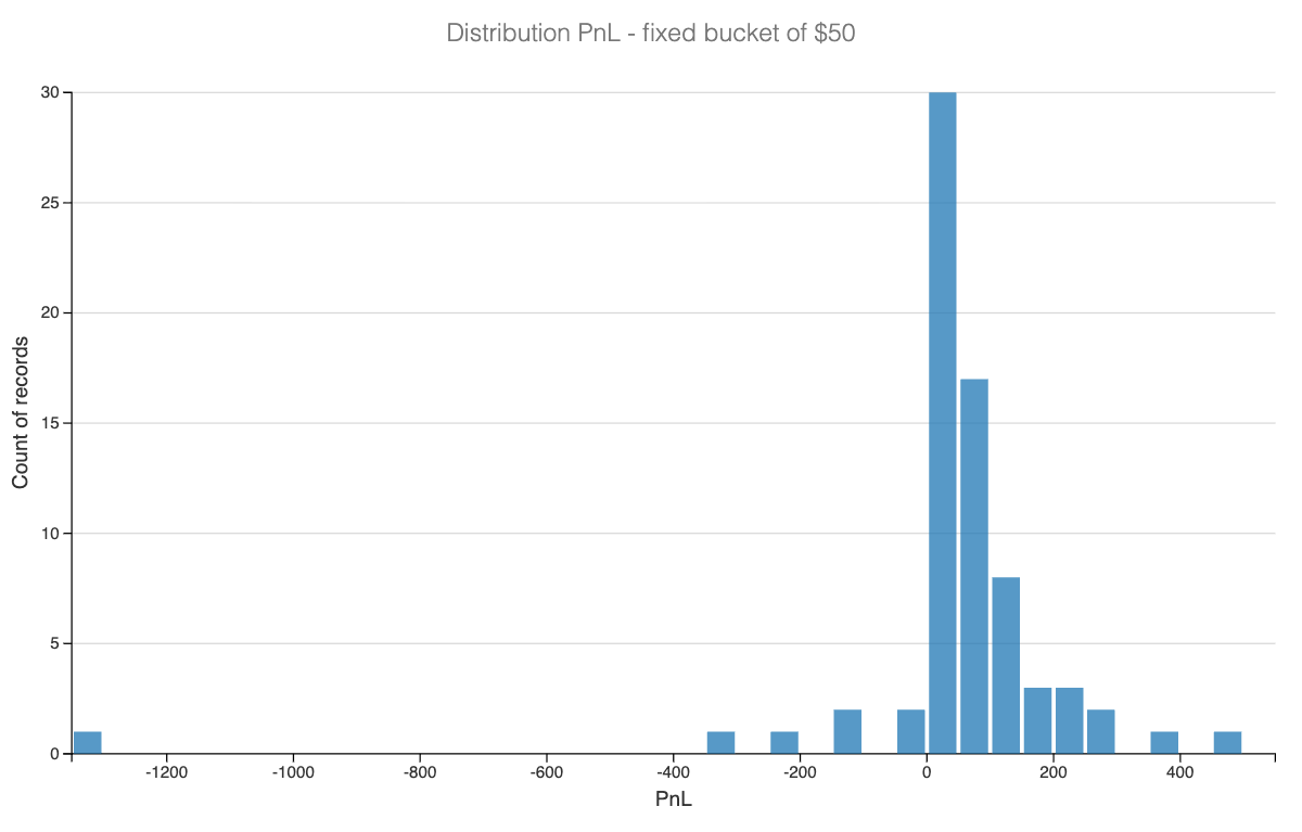 It is also interesting to note that we did suffer somewhat during the market rout in October, before results improved and then stayed steady until now. This is consistent with what we observed in the backtests. While there is clearly an edge, you are still short convexity, which means market routs will hurt more often than not. This shows up clearly in the PnL distribution.