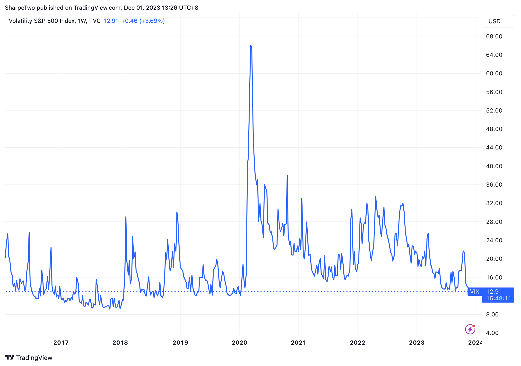 This is the VIX index, the most renowned measure of implied volatility in the S&P 500, observed over the last five years.