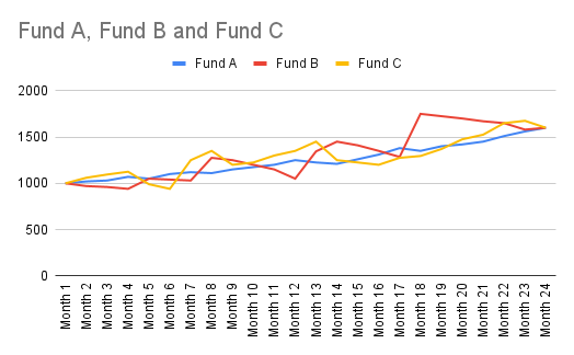 When examining these three strategies, a rational investor would typically opt for the one offering peace of mind, meaning the least volatile. In this case, it's Fund A, represented in blue, which avoids the extreme fluctuations in Funds B and C.