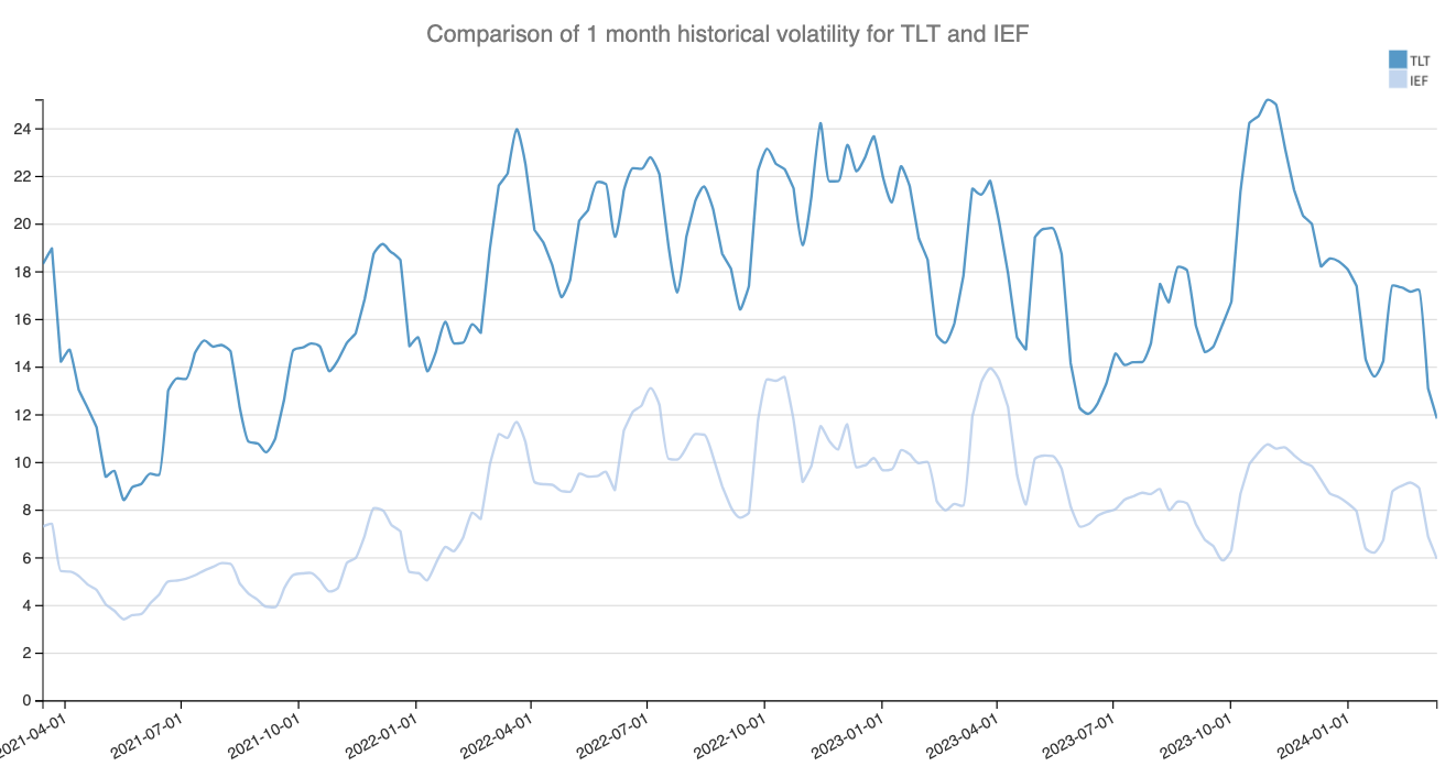 Since the turn of the year, the bond rally has stalled, and we are waiting for the anticipated rate cuts to materialize. That being said, the realized volatility in some of these bonds has significantly decreased from the highs observed during the hiking cycle and at the end of last year during the relief rally.