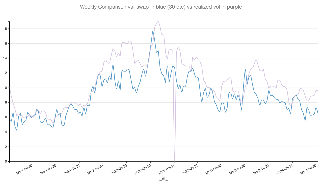 Let’s start by comparing the realized volatility at 30 days in LQD to the variance swap at 30 days, using the bid price over the last few years.