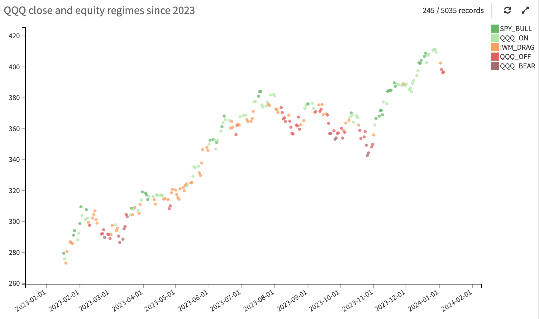 Our equity regime indicator has just signaled that we've entered a phase where the QQQ is experiencing a sell-off. This period is typically not ideal for maintaining an actively long position in the market, especially with a short-term mindset.