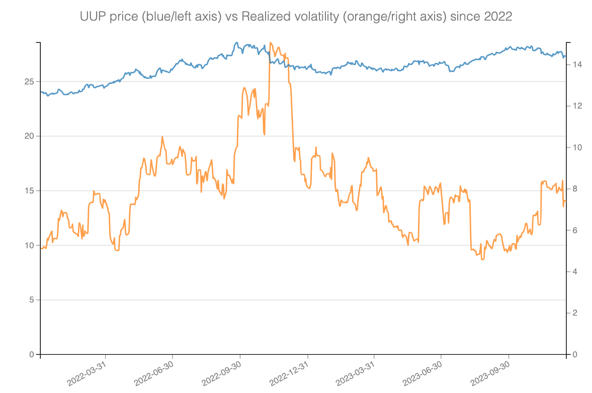 As the Fed raised rates in 2022, the dollar index soared to new heights, accompanied by a rise in realized volatility. Market participants were scrambling to buy back dollars. It's interesting to note that this pattern fundamentally differs from the equities market, where realized volatility tends to increase when equities fall.