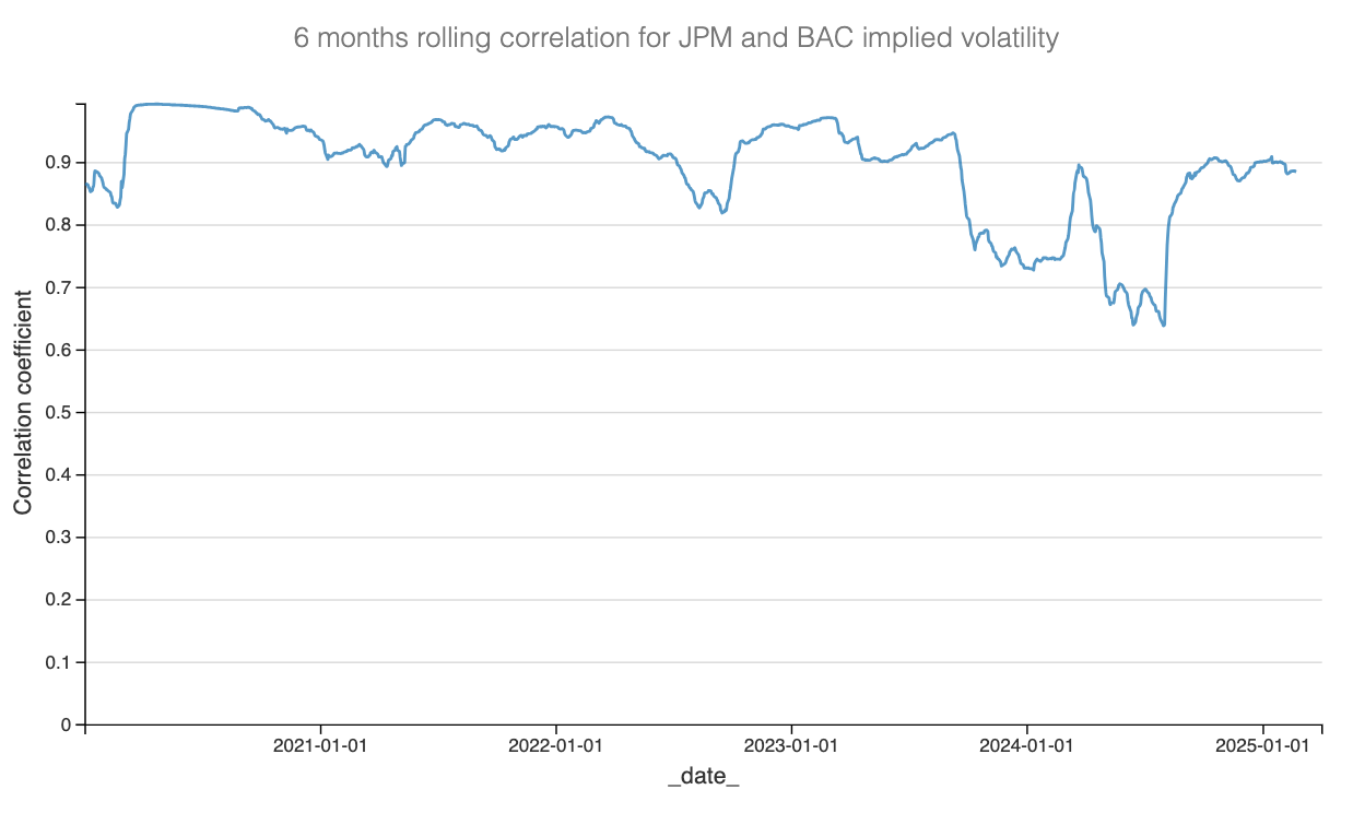 What stands out—without needing any fancy transformation—is that JPM’s implied volatility has dropped much faster than BAC’s. It’s possible that, given recent economic shifts, they may not mean-revert in the same way this time. But to get a better feel for that, let’s look at how their correlation has evolved over time.
