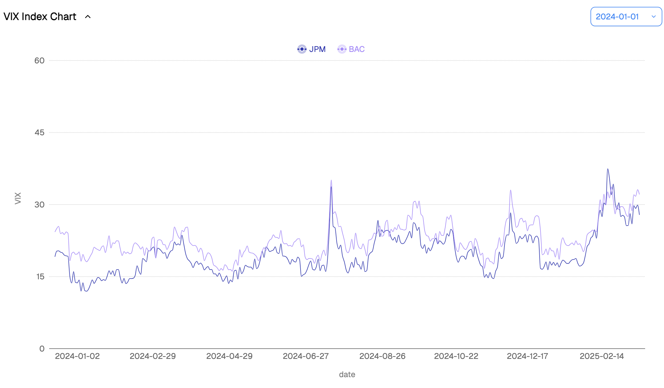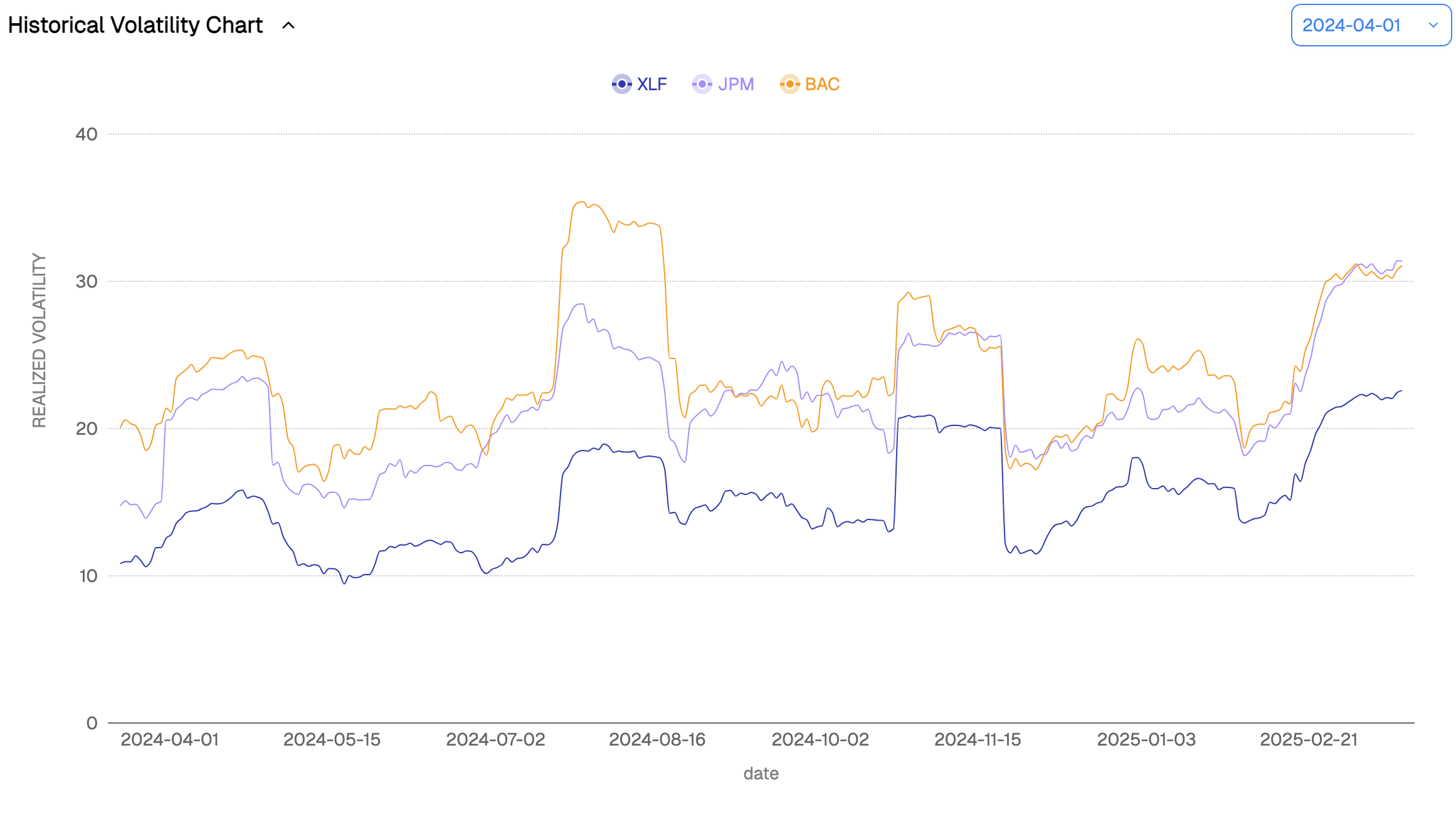 If we take last August as the last true moment of market panic, current 30-day realized volatility is already above those levels for both XLF and JPM. BAC, which had reacted more sharply back then, still has a few percentage points to go.