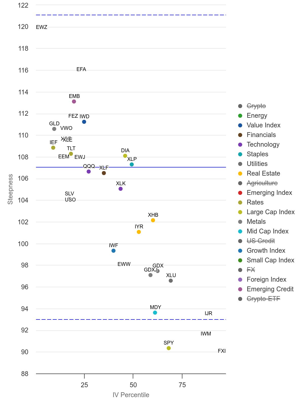 Currently positioned in the bottom right corner, it's clear that implied volatility for IWM is significantly elevated, accompanied by a notable steepness in its volatility term structure (steepness here is quantified as the ratio between 6-month IV and 2-month IV).