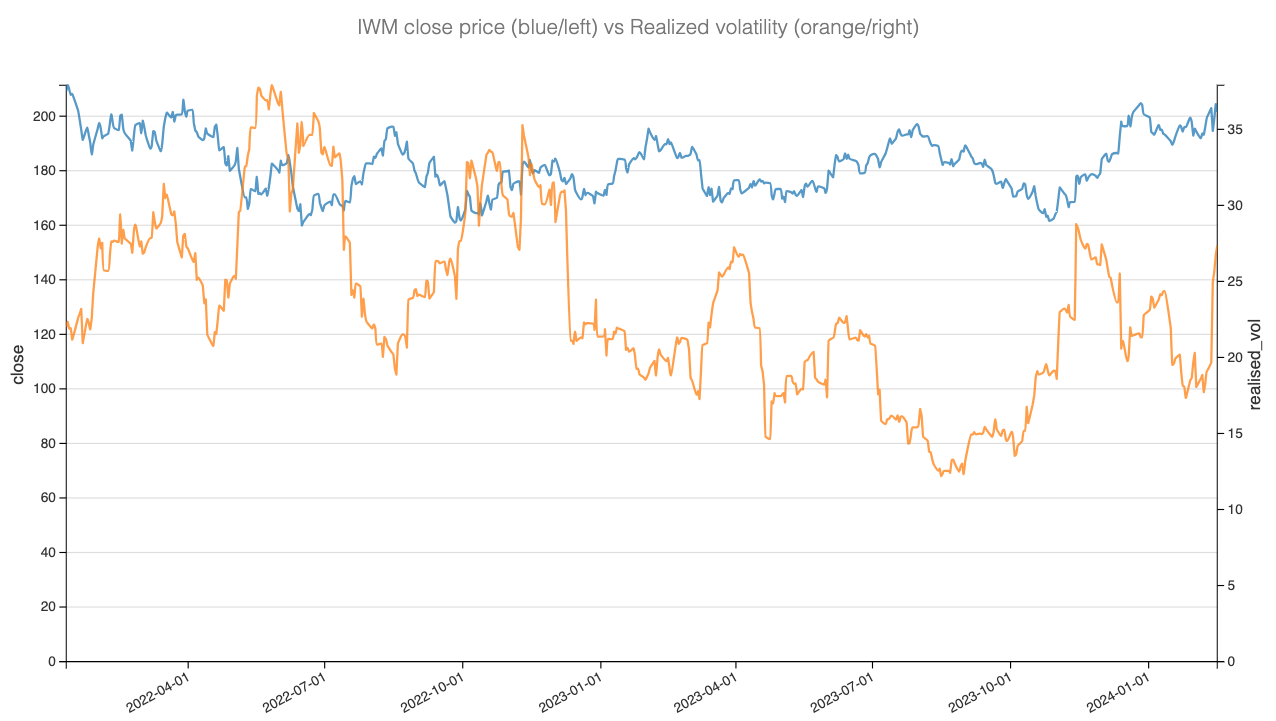 Last week, the realized volatility in IWM has notably surged above 27. This brings us close to the peak levels observed last year and not too distant from the volatility experienced when the Federal Reserve commenced its rate-hiking cycle.