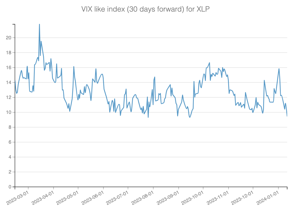 The graph above represents a VIX-like index for XLP. It shows that following the market's Q3 turbulence, the index for XLP spiked alongside the broader market volatility, only to gradually decline in November and December to some of its lowest levels.