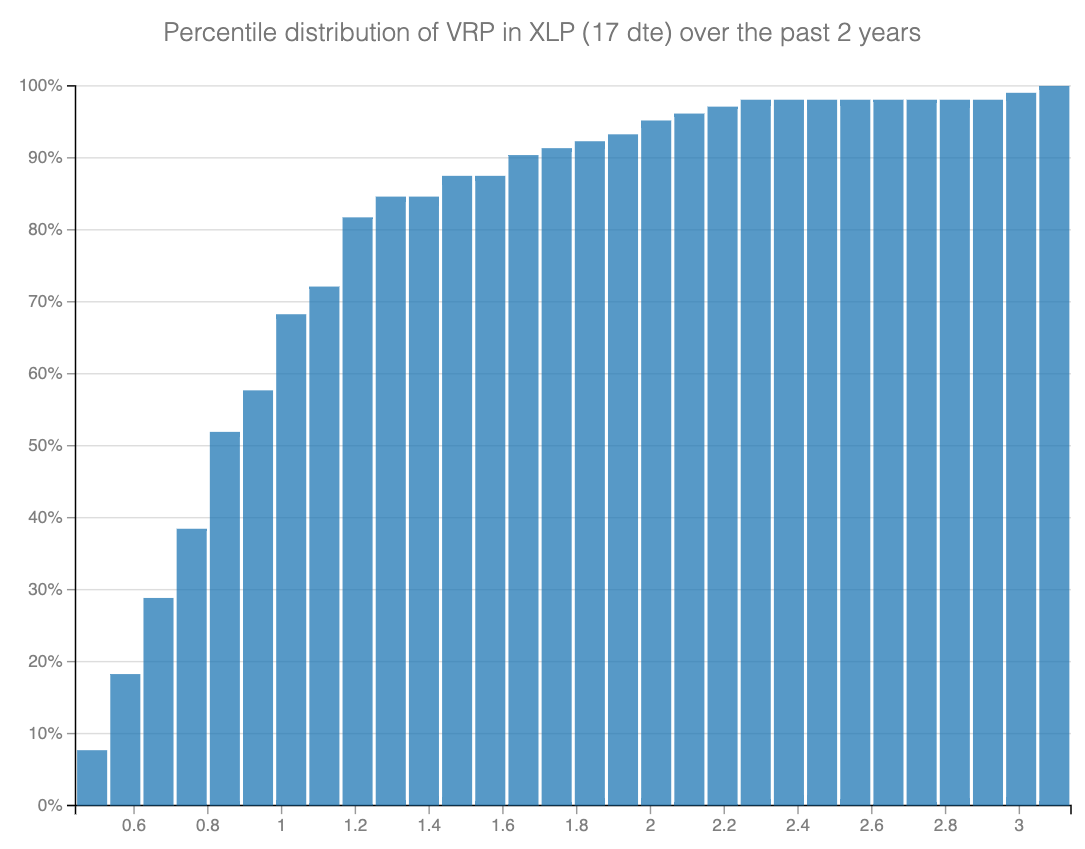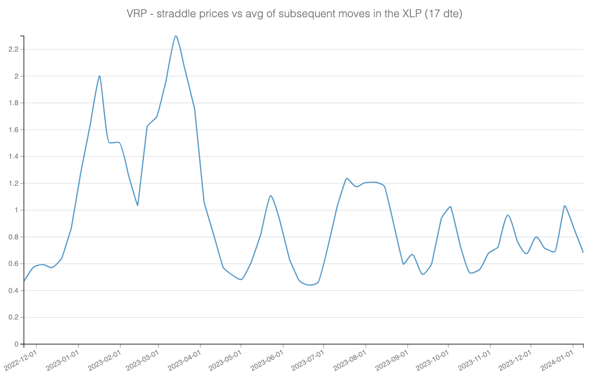 As our regular SharpeTwo readers know, we often look at the Variance Risk Premium (VRP), particularly focusing on how the price of straddles compares to subsequent movements in the underlying assets. For XLP, we've been examining the 17 DTE straddles and their corresponding price movements.